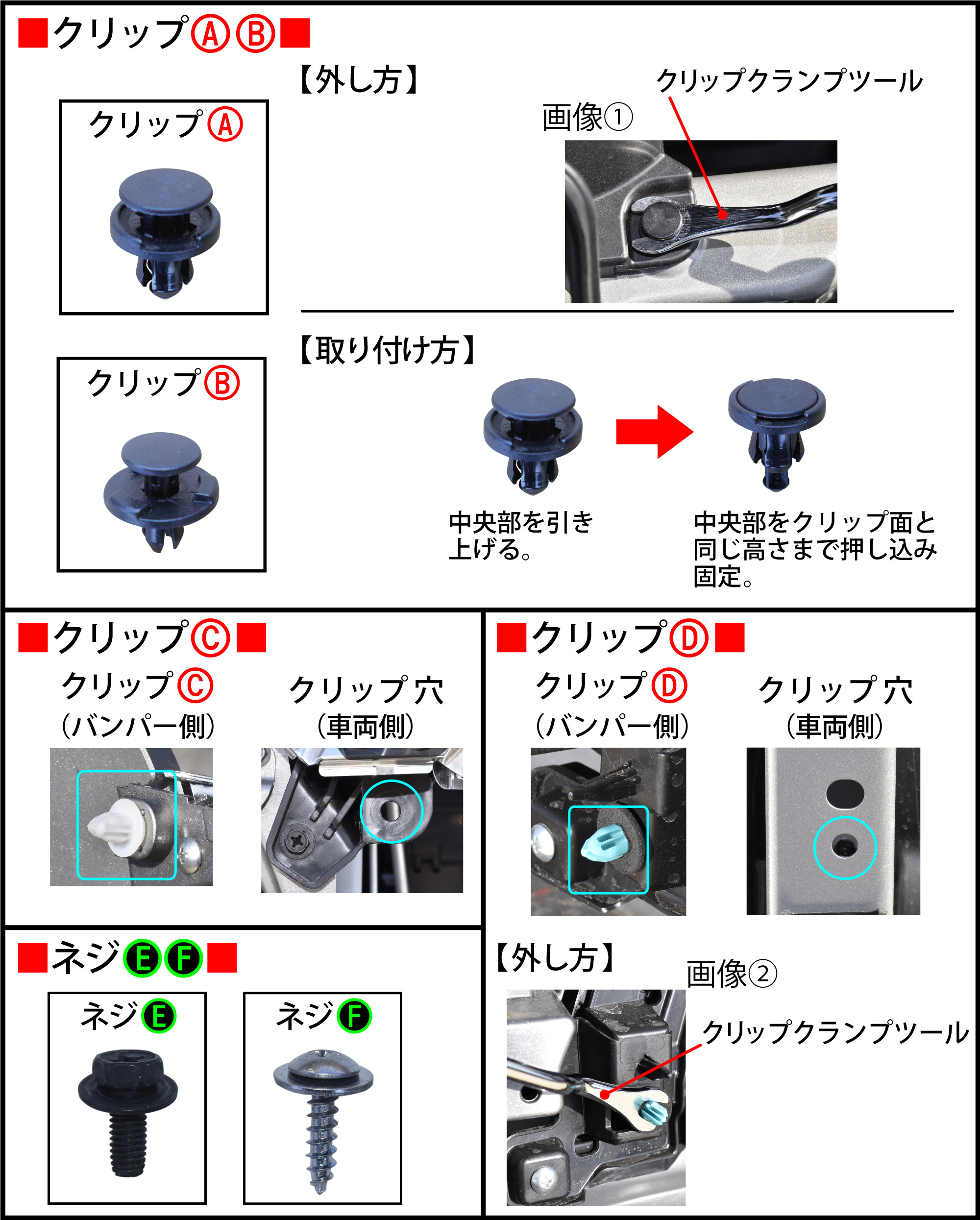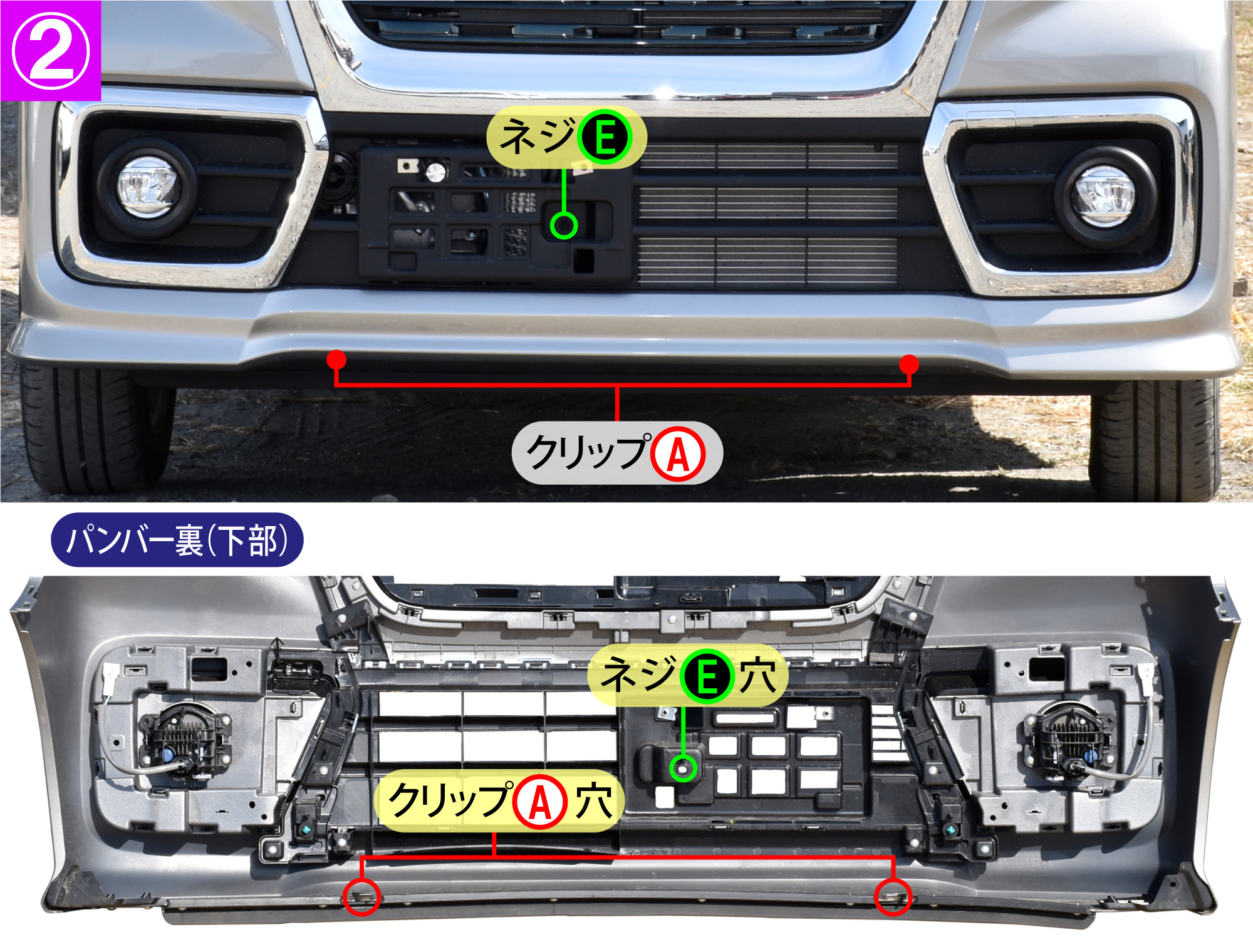 - ナンバープレートを外し、ナンバープレート裏にあるネジE(1箇所)とバンパー下面にあるクリップA(2箇所)を外します。