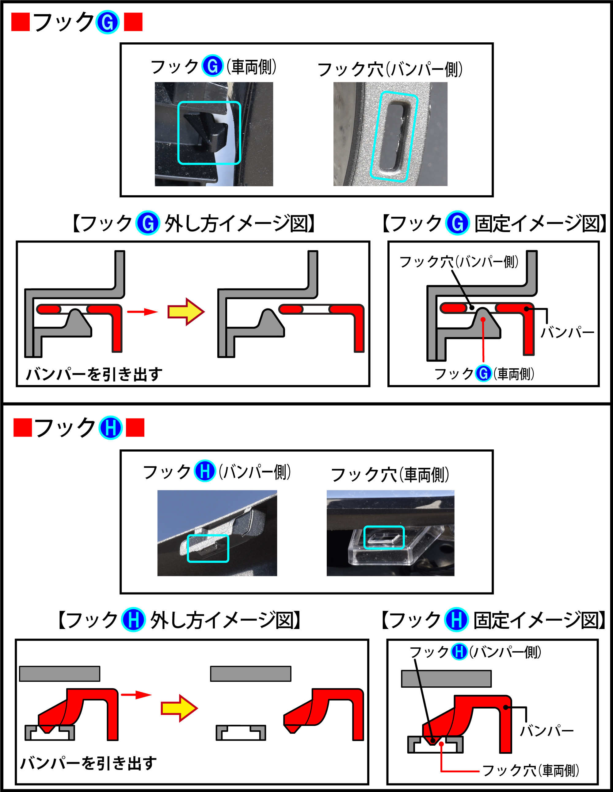 『フックG外し方イメージ図』のようにバンパーを引き出します。