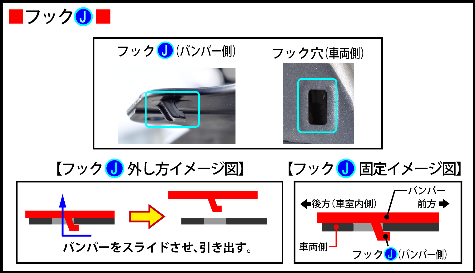 『フックJ外し方イメージ図』のようにバンパーを引き出します。