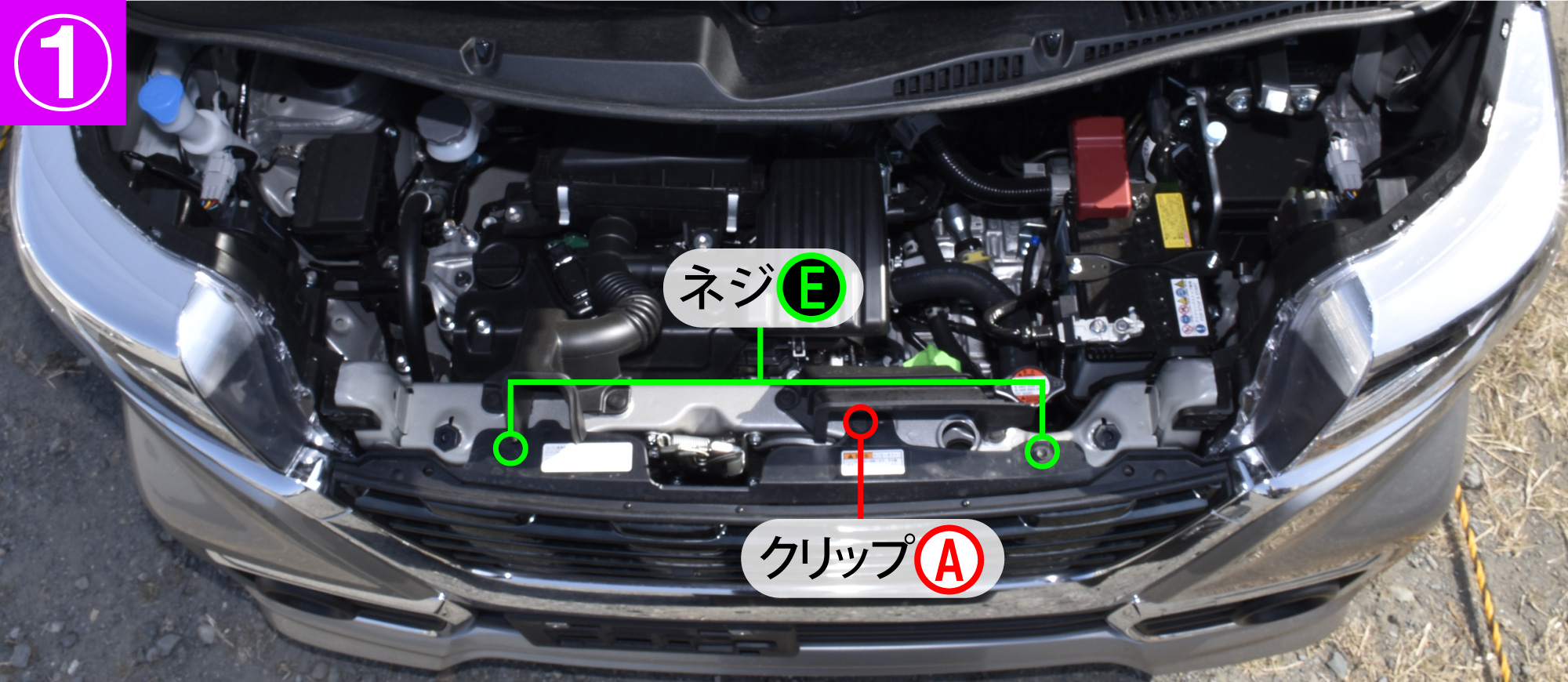 - ボンネットを開け、バンパー上面のクリップA(1箇所)とネジE(2箇所)を外します。