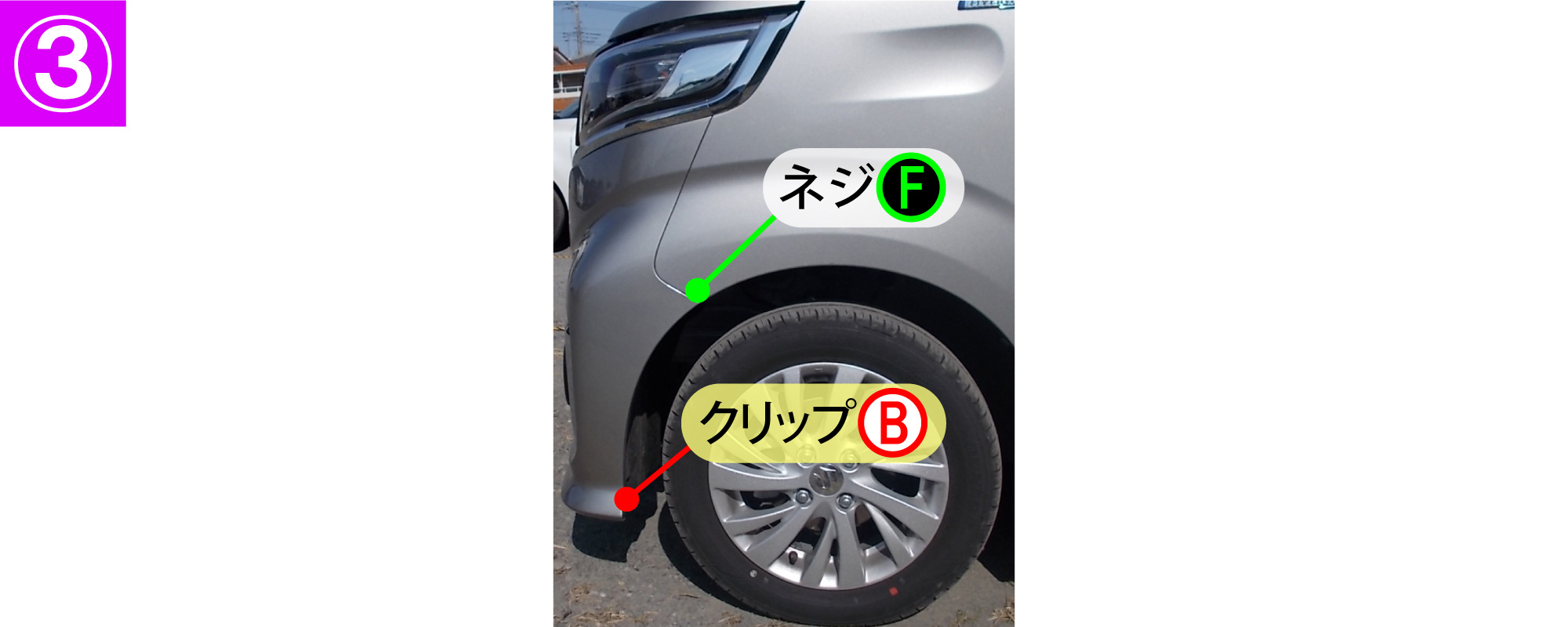 - タイヤハウス内のネジF(左右各1箇所)とクリップB(左右各1箇所)を外します。