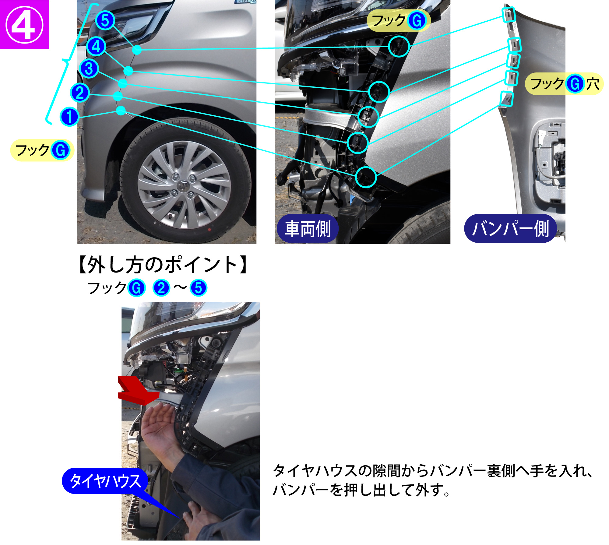 - バンパー端部のフックG(左右各5箇所)を①~⑤の順番で外します。なお、フックGの②~⑤は、外し方のポイントに示すようにタイヤハウスの隙間からバンパー裏側へ手を入れ、バンパーを押し出して外します。