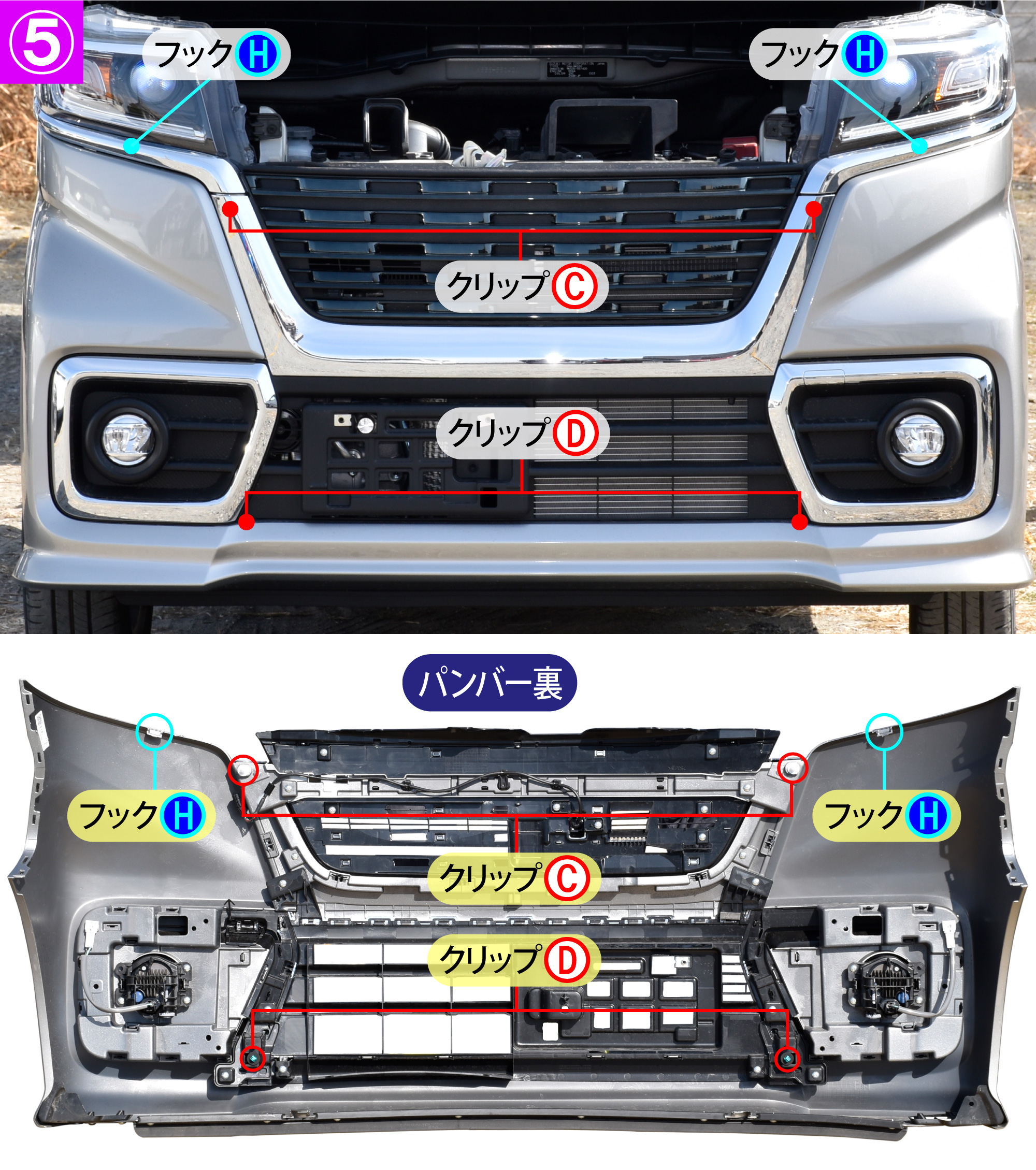 - バンパー裏にあるフックH(2箇所)とクリップC(2箇所)とクリップD(2箇所)を外します。