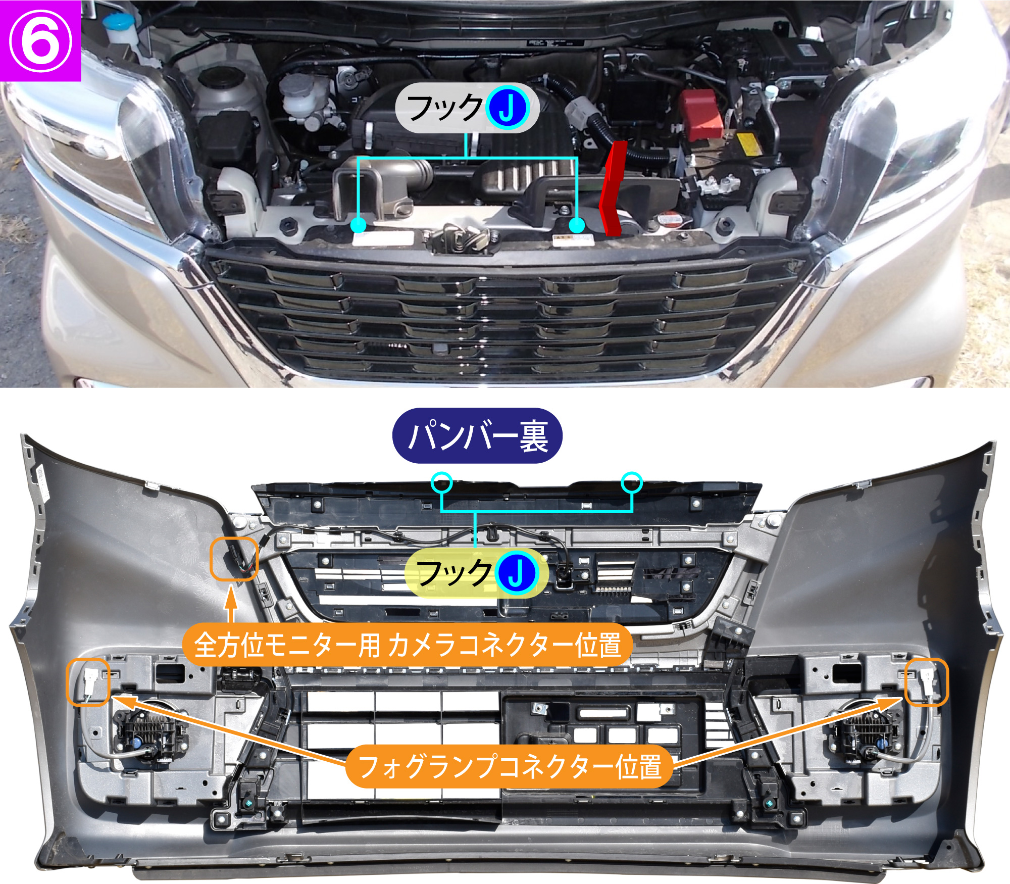 - バンパーの上面からフックJ(2箇所)を外すと、バンパーが外れます。このとき、バンパーにカメラやフォグランプ等の部品が固定されていますので、バンパー裏にある配線などを損傷させないよう注意してください。