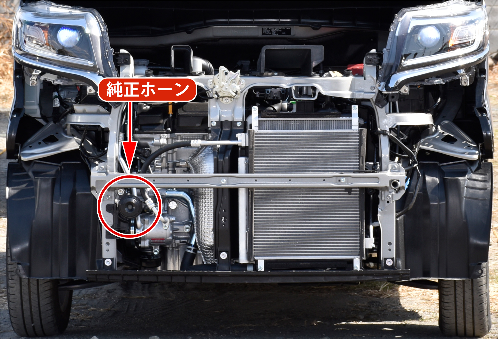 新設ホーンは、純正ホーン位置の上側と助手席側ヘッドライト下の位置へ取り付けます。