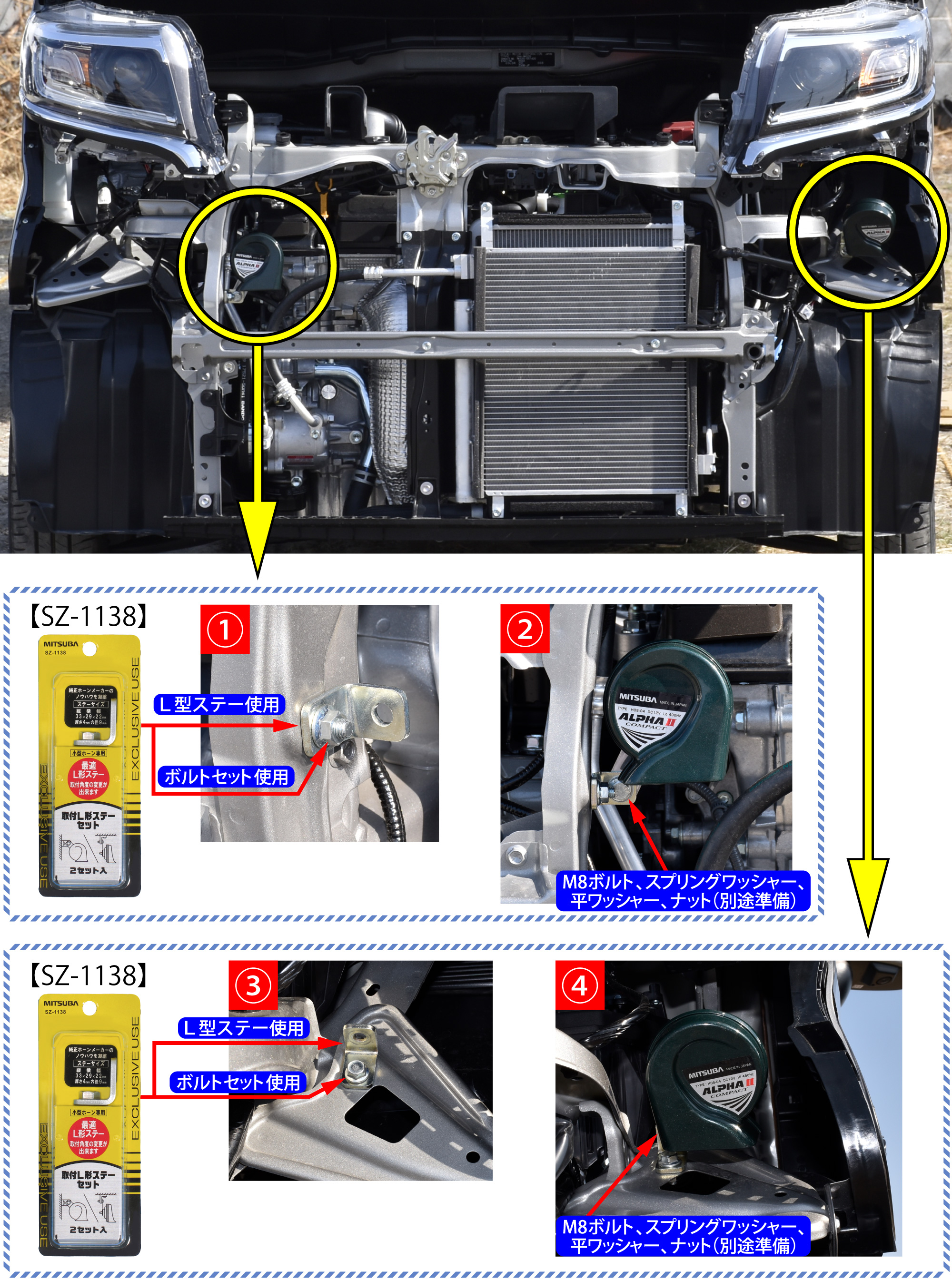 ①:純正ホーン位置の上側の位置にあるサービスホールへL形ステー(SZ-1138)をボルトセット(取付L形ステーセット同梱)で画像のように固定します。