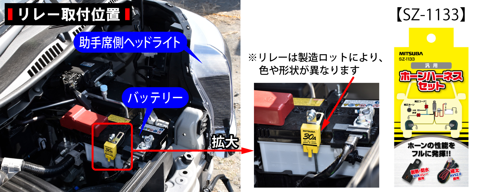 ※ホーンハーネスセット(SZ-1133)とは、ホーン接続用にリレー回路が組まれた配線キットです。ミツバ製ホーンはもちろん、各メーカーのホーンも簡単・確実・短時間で配線出来ます。