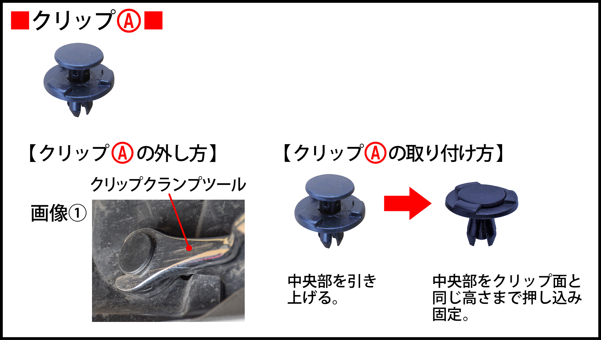 クリップクランプツール等で画像①のように中央部を少し引き上げ、クリップ全体を手で引き抜きます。