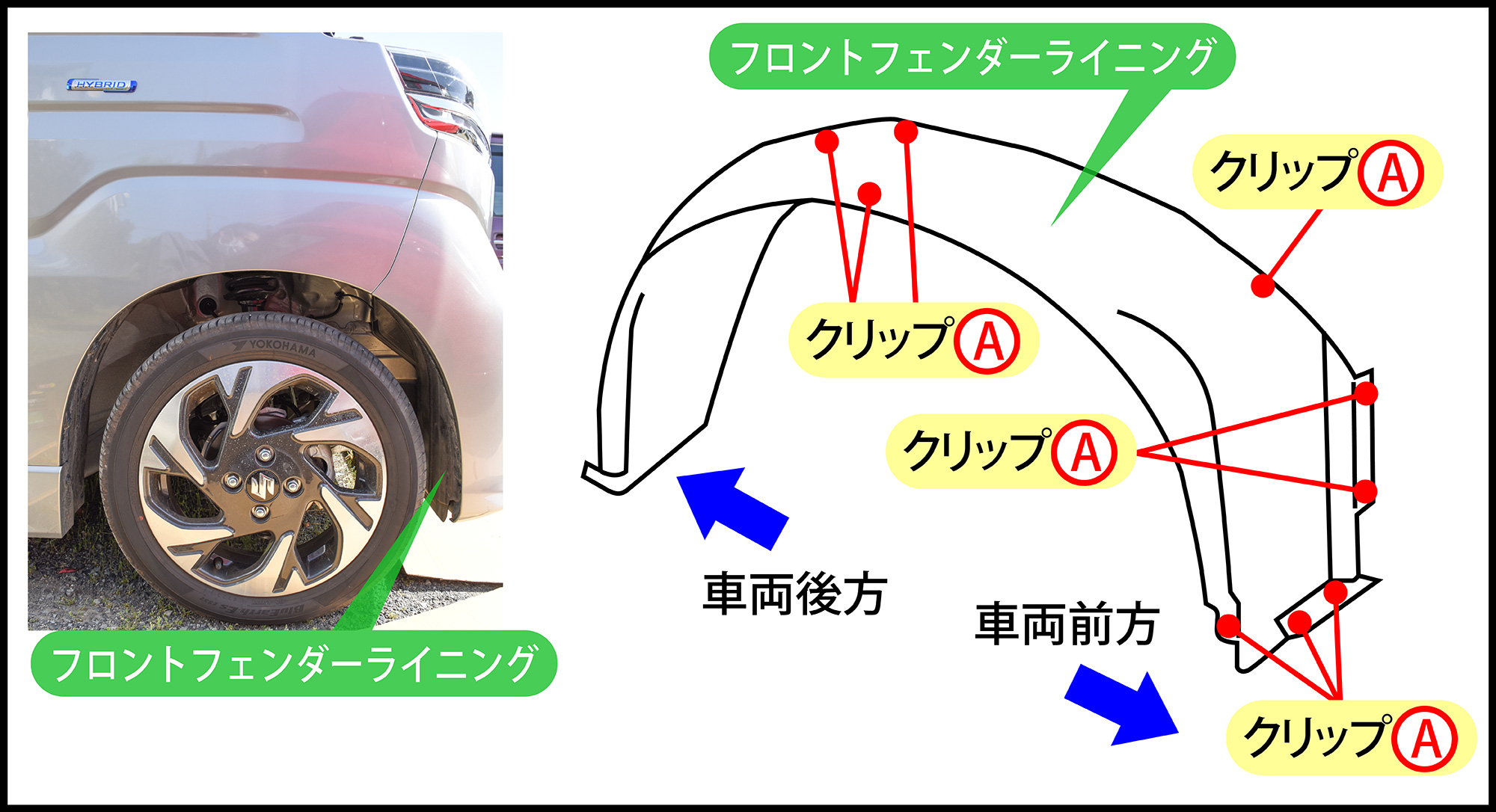 運転席側フェンダ裏のフロントフェンダライニングを固定しているクリップA(9箇所)を外します。