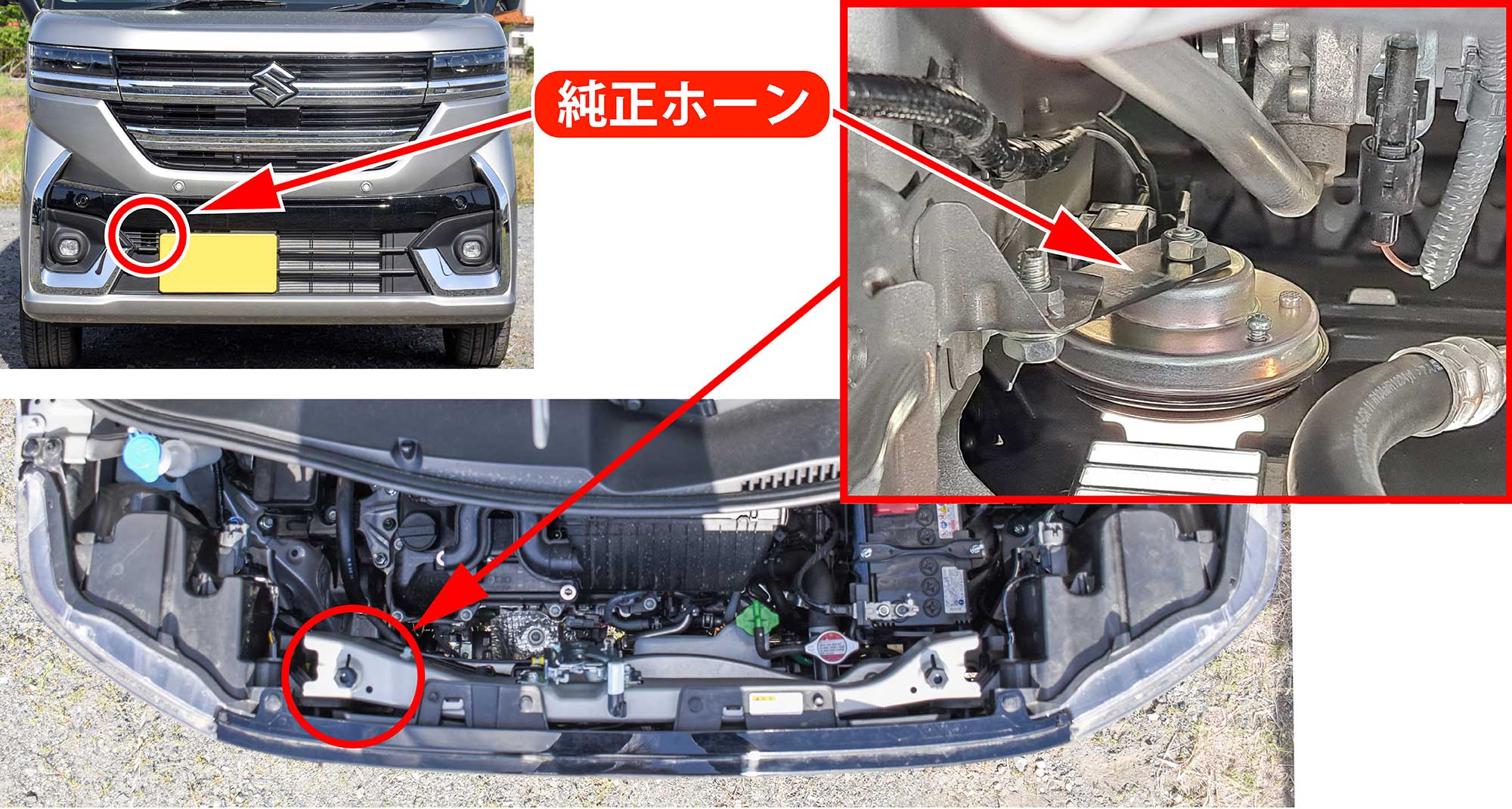 スズキ スペーシアカスタム(MK94S)のホーン交換をご紹介します。
