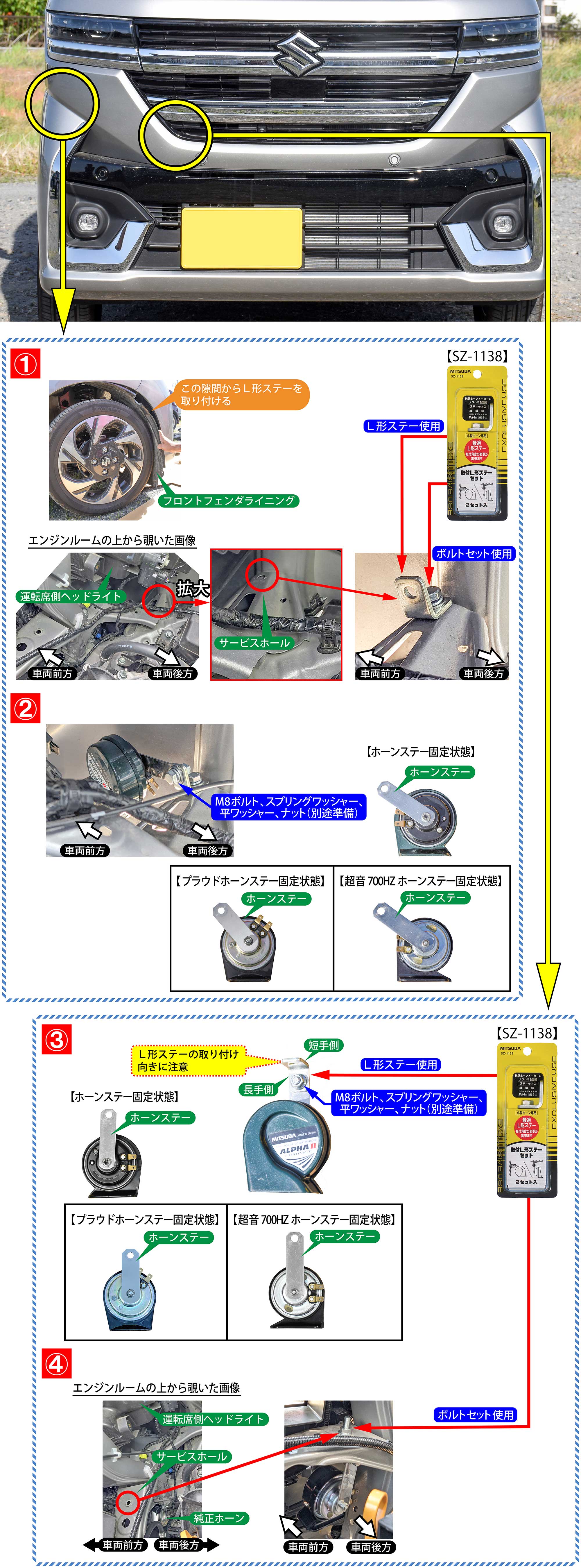 ホーンハーネスセット(SZ-1133)と純正変換コード1(SZ-1151)を使用して配線します。同梱のリレーは、市販ステーを加工して画像の位置へ取り付けます。(市販ステー・M6ボルト、スプリングワッシャー、平ワッシャー、ナット別途準備)。ハーネスを引き回す際は、高温になる場所や回転機等を避けてください。