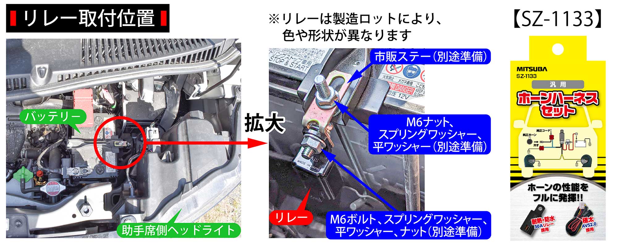 ※ホーンハーネスセット(SZ-1133)とは、ホーン接続用にリレー回路が組まれた配線キットです。ミツバ製ホーンはもちろん、各メーカーのホーンも簡単・確実・短時間で配線出来ます。