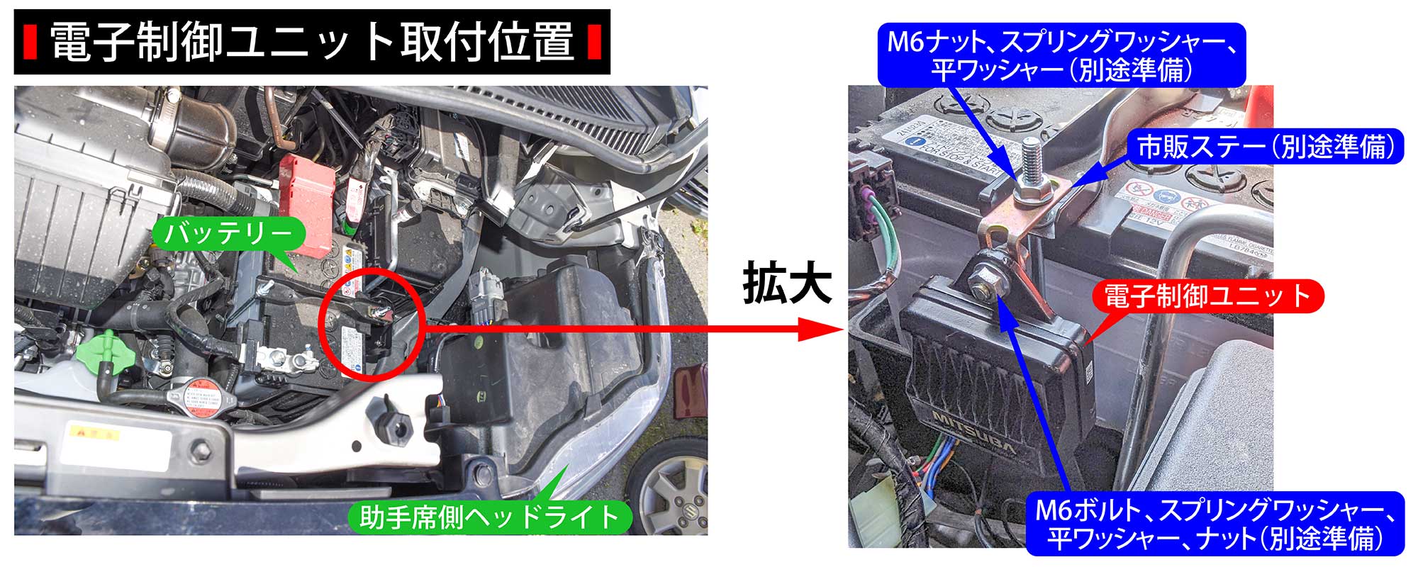 同梱の電子制御ユニットは、市販ステーを加工して画像の位置へ取り付けます。(市販ステー・M6ボルト、スプリングワッシャー、平ワッシャー、ナット別途準備)ハーネスを引き回す際は、高温になる場所や回転機等を避けてください。