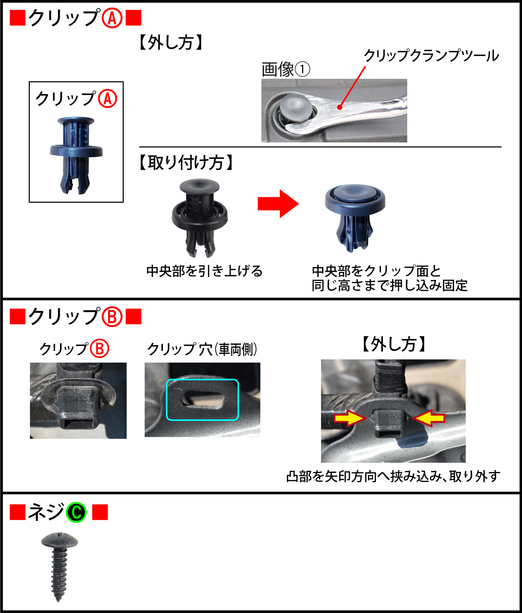 2.事前準備、クリップ、フック、ネジの形状とクリップ、フックの外し方・取り付け方