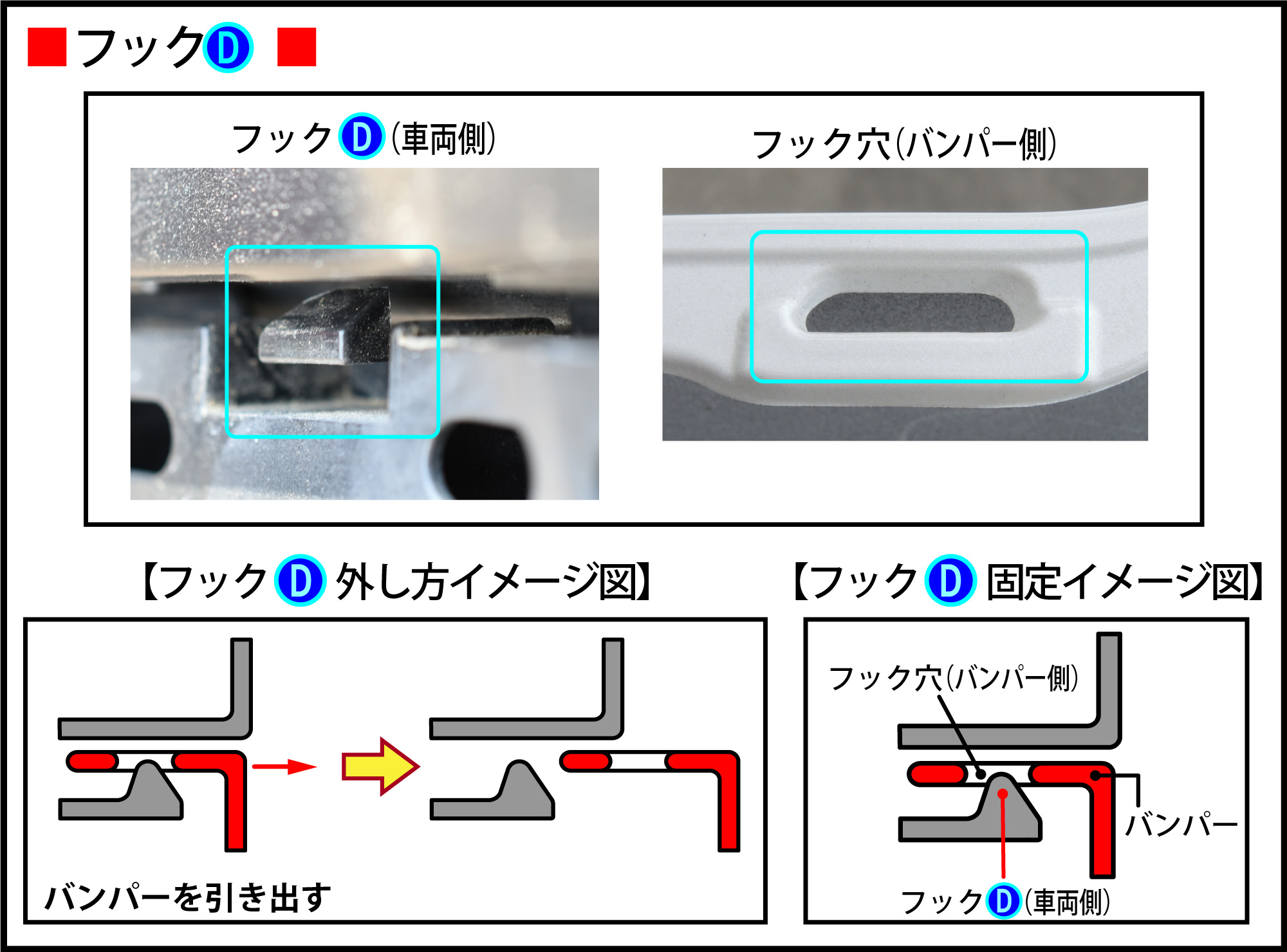 『フックD外し方イメージ図』のようにバンパーを引き出します。