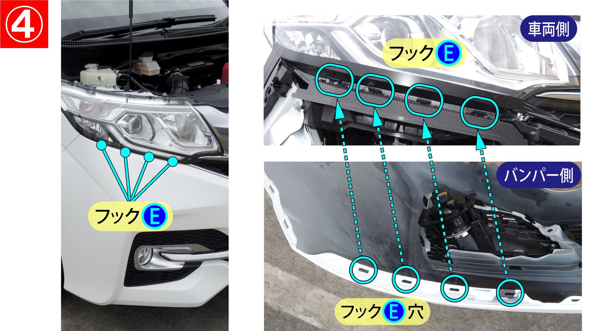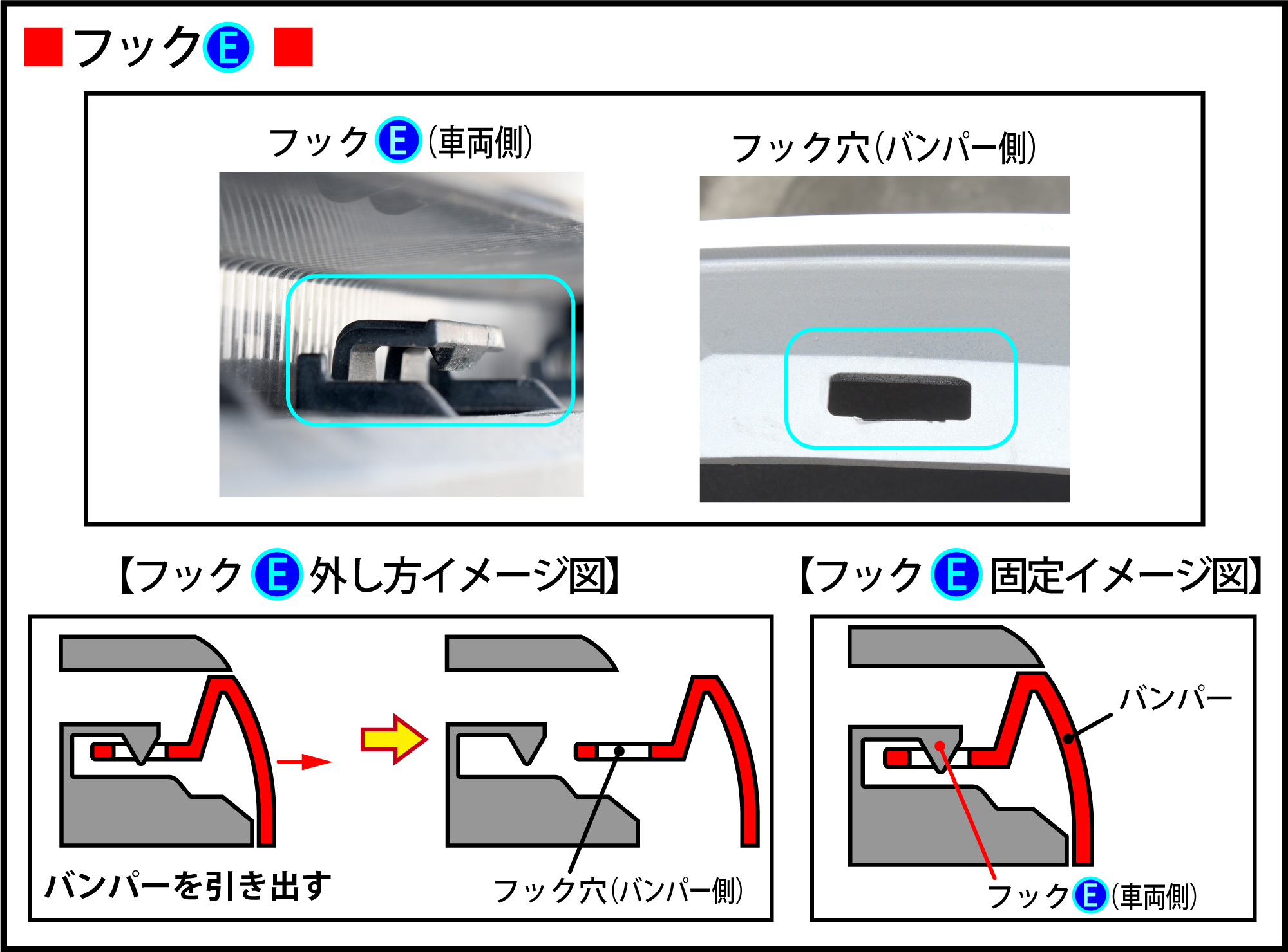 『フックE外し方イメージ図』のようにバンパーを引き出します。