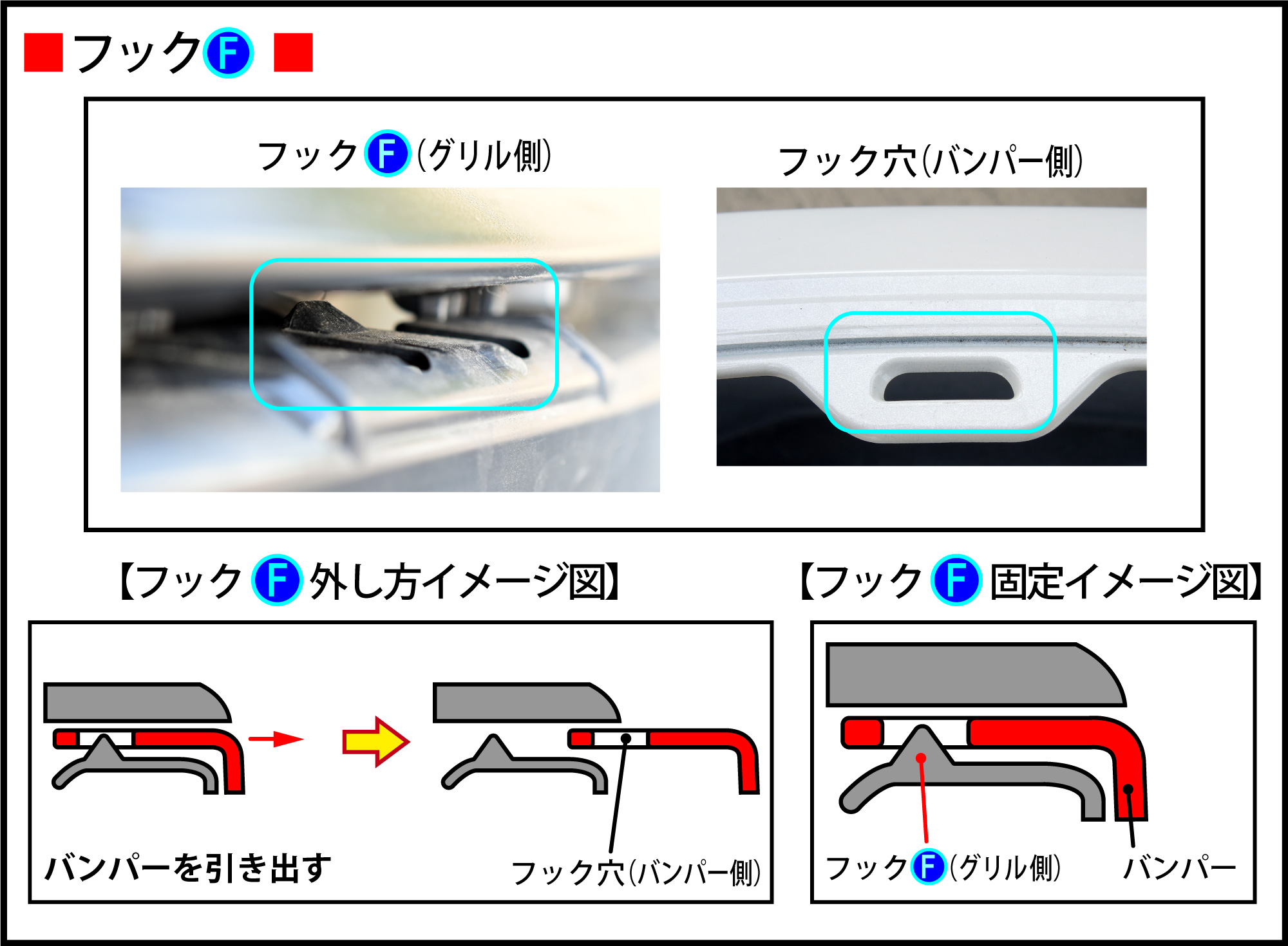 『フックF外し方イメージ図』のようにバンパーを引き出します。