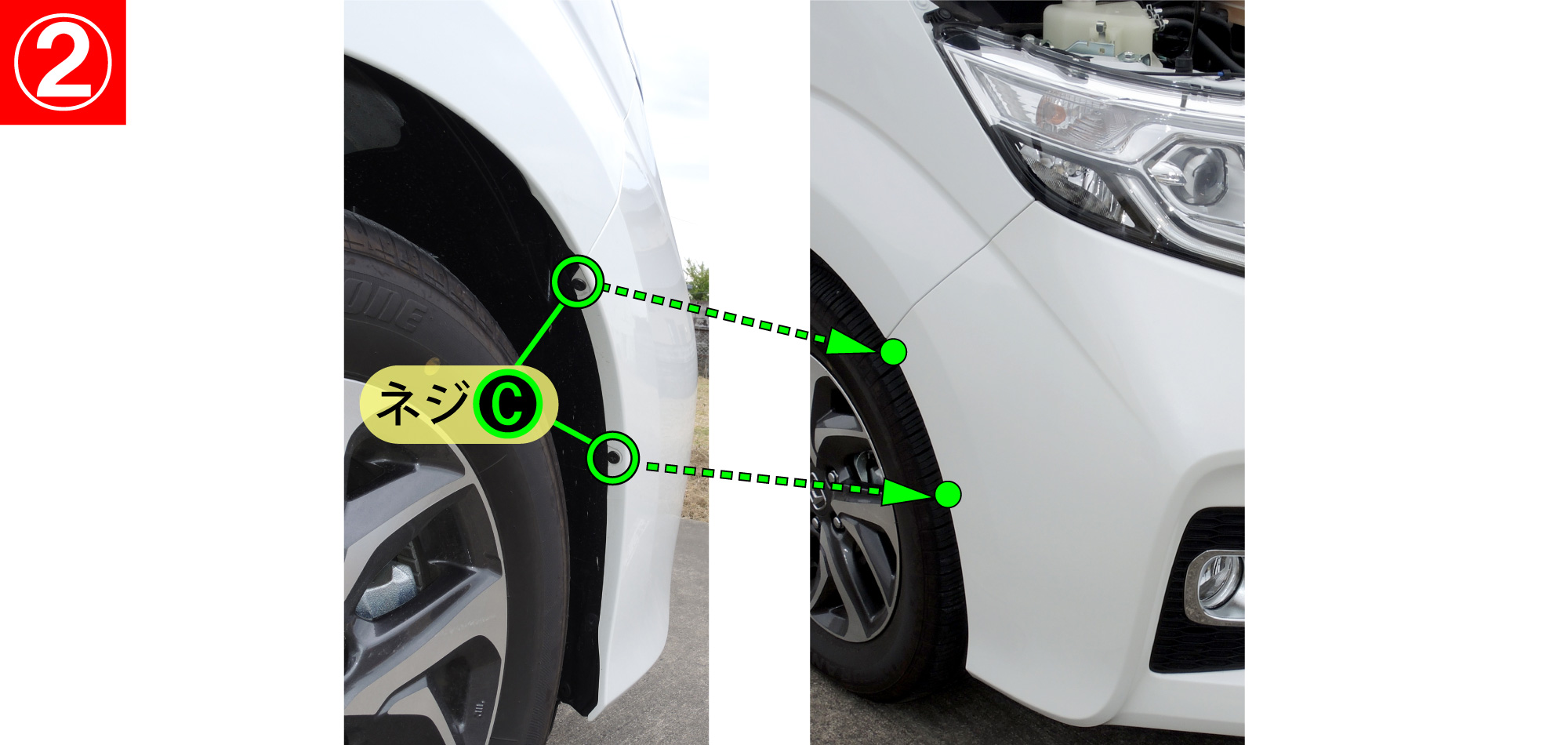 - タイヤハウス内のネジC(左右各2箇所)を外します。
