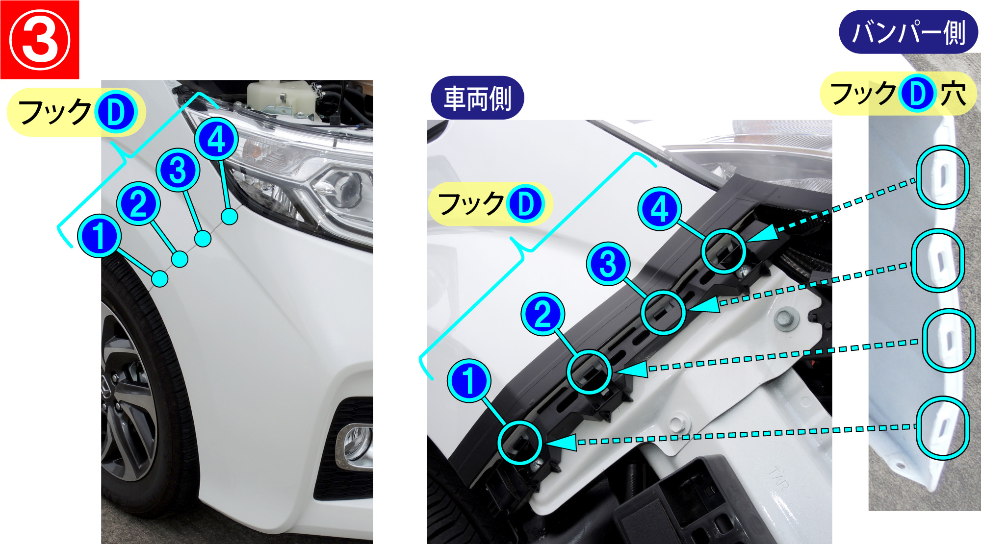 - バンパー端部のフックD(左右各4箇所)を①~④の順番で外します。