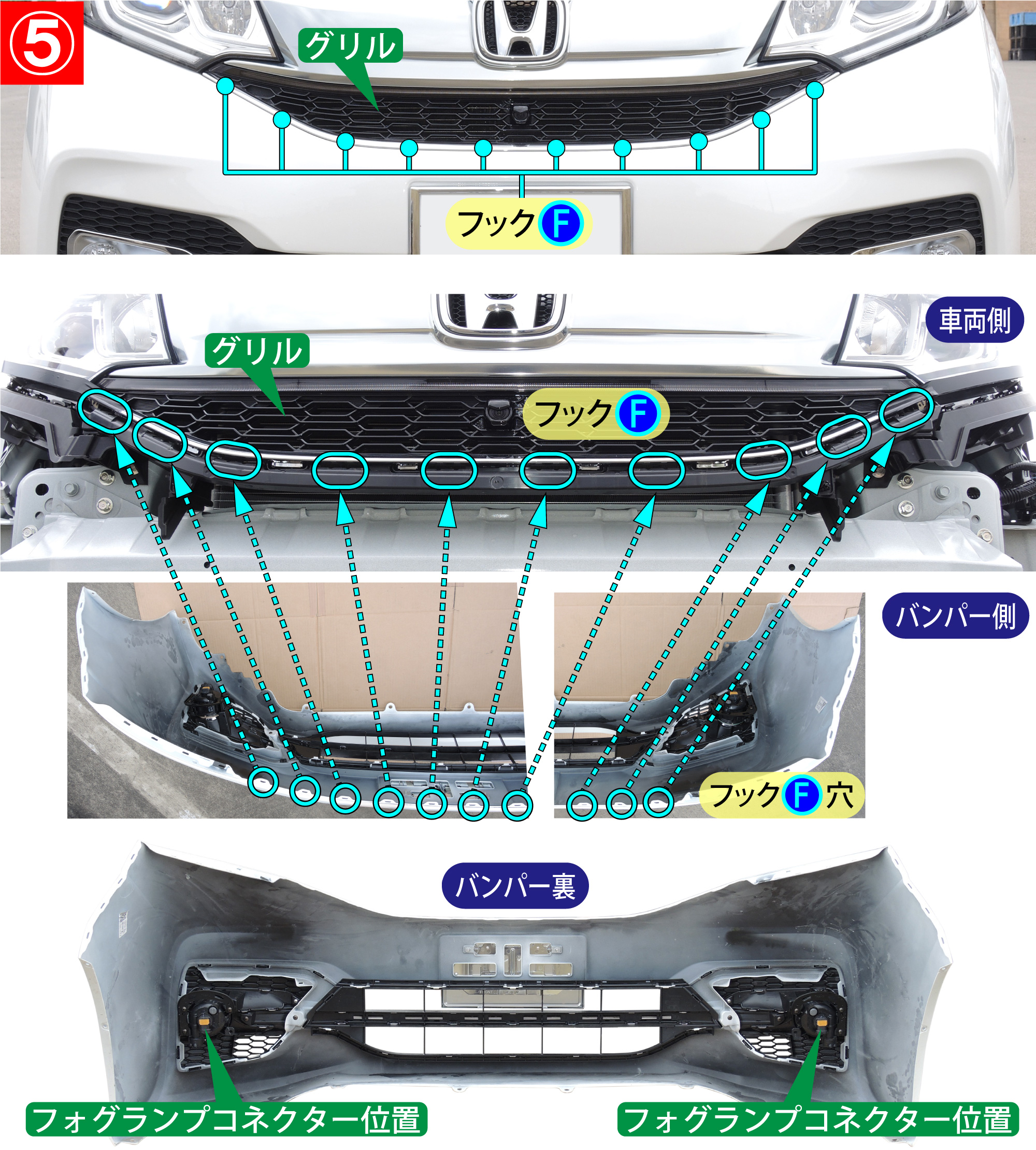 - グリル下面にあるフックF(10箇所)を外すとバンパーが外れます。このとき、バンパー裏にフォグランプの部品が固定されていますので、配線などを損傷させないよう注意してください。