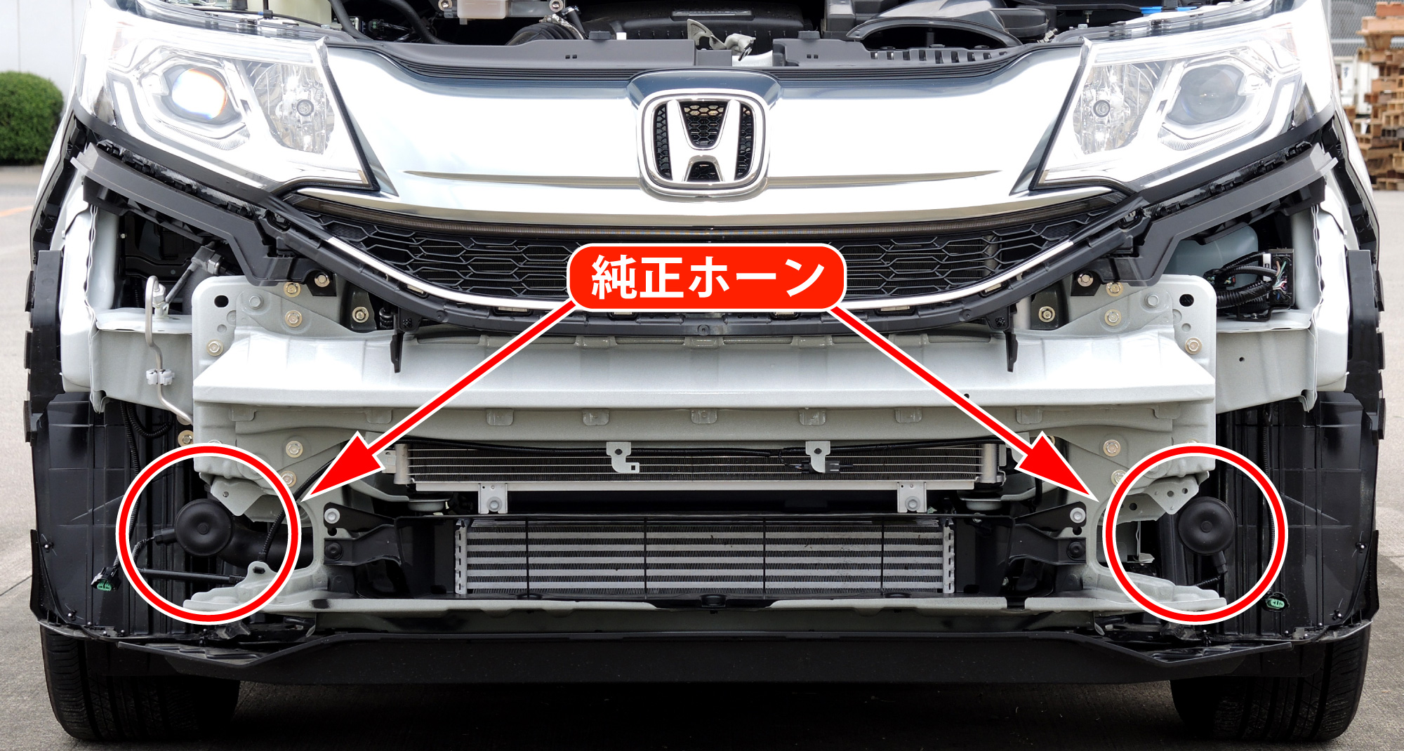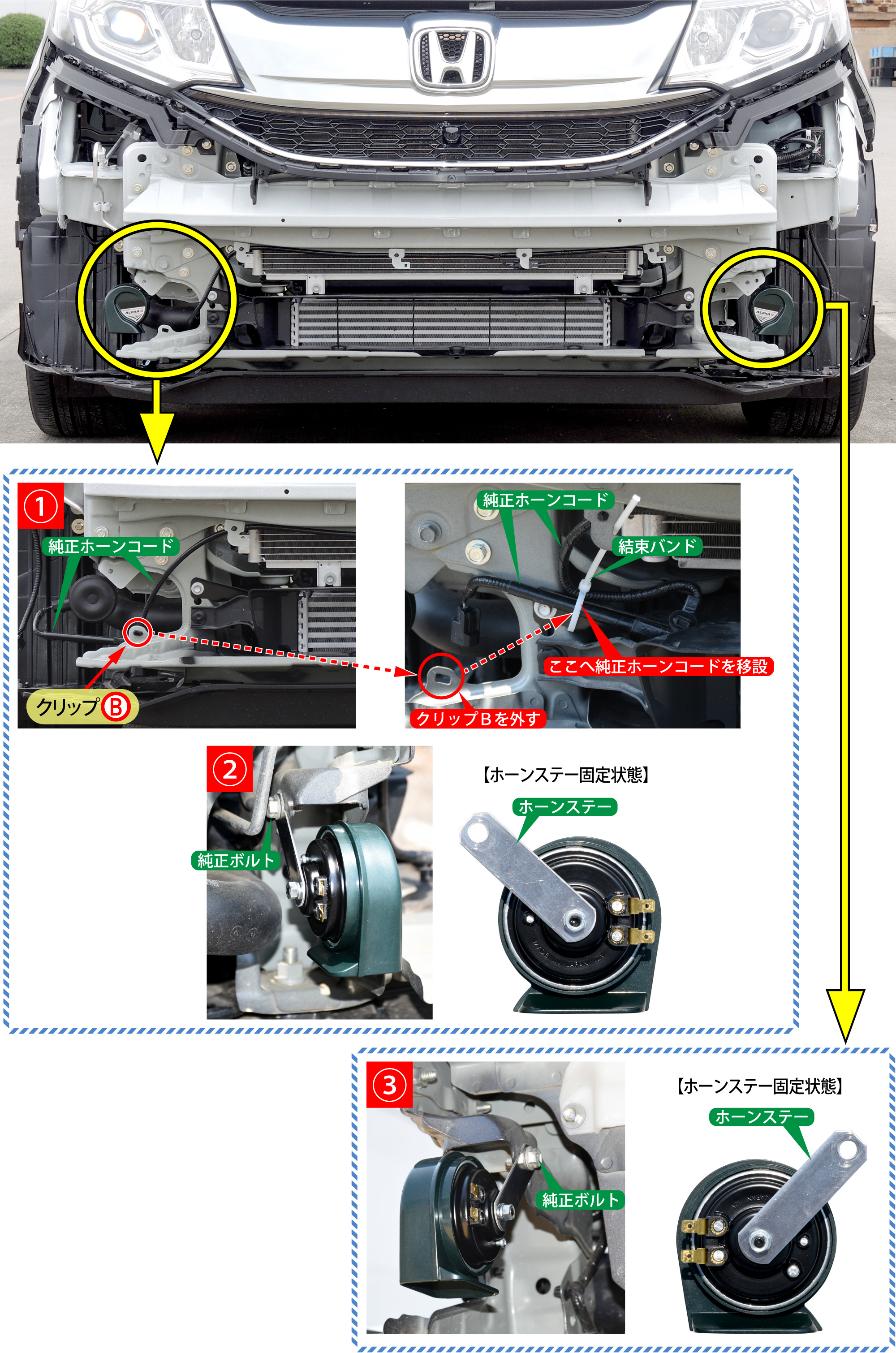 新設ホーンは、純正ホーンの位置へ各々取り付けます。
