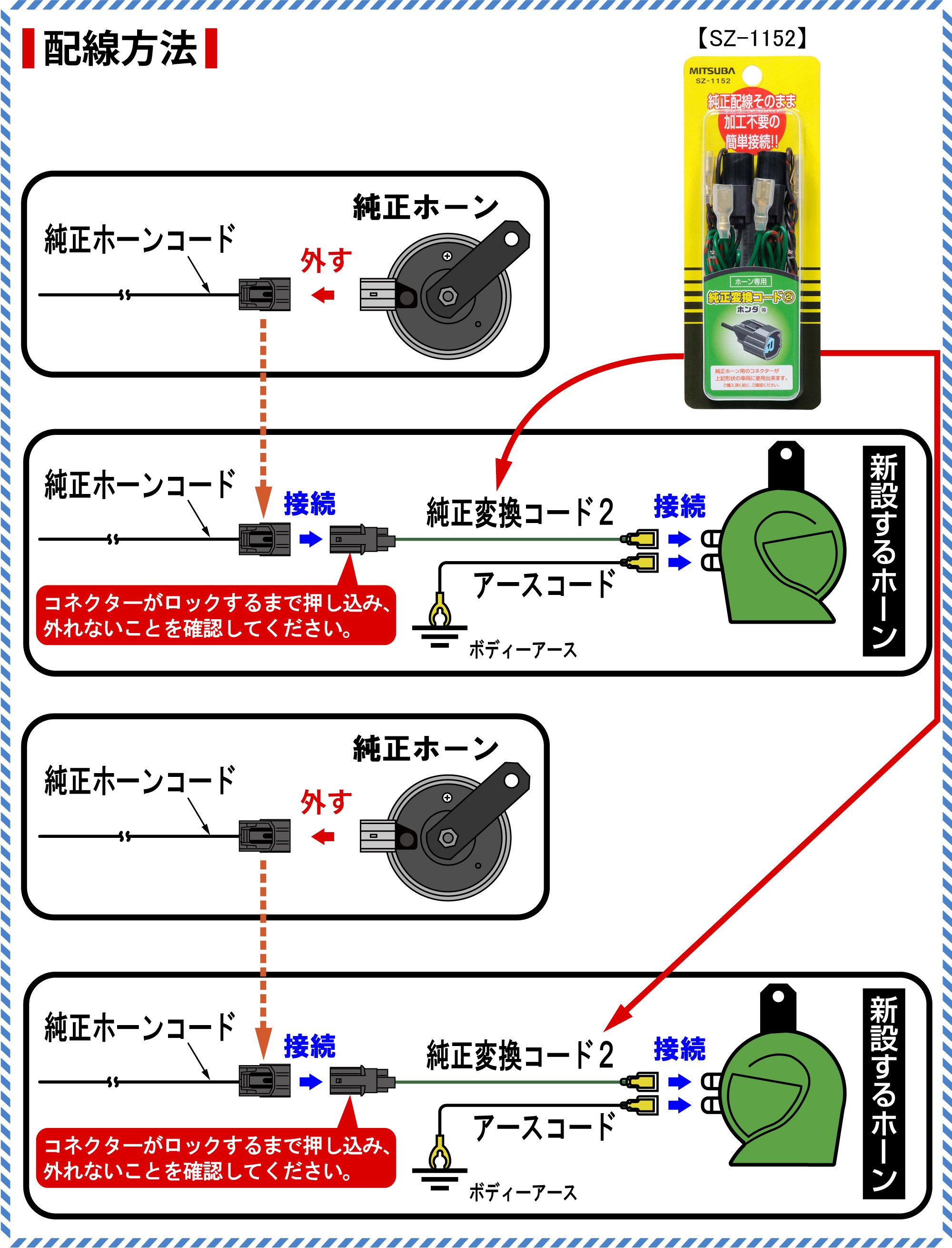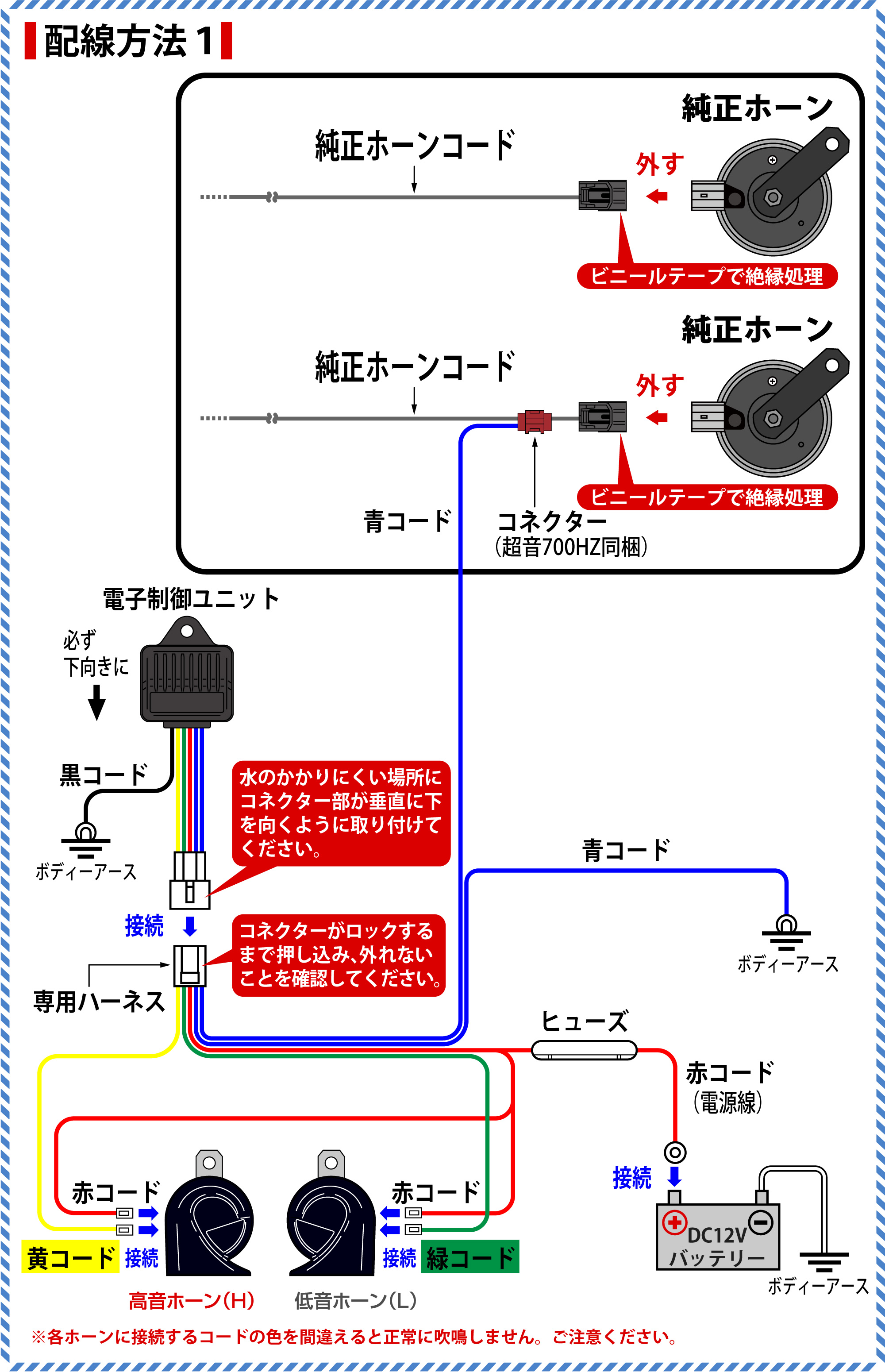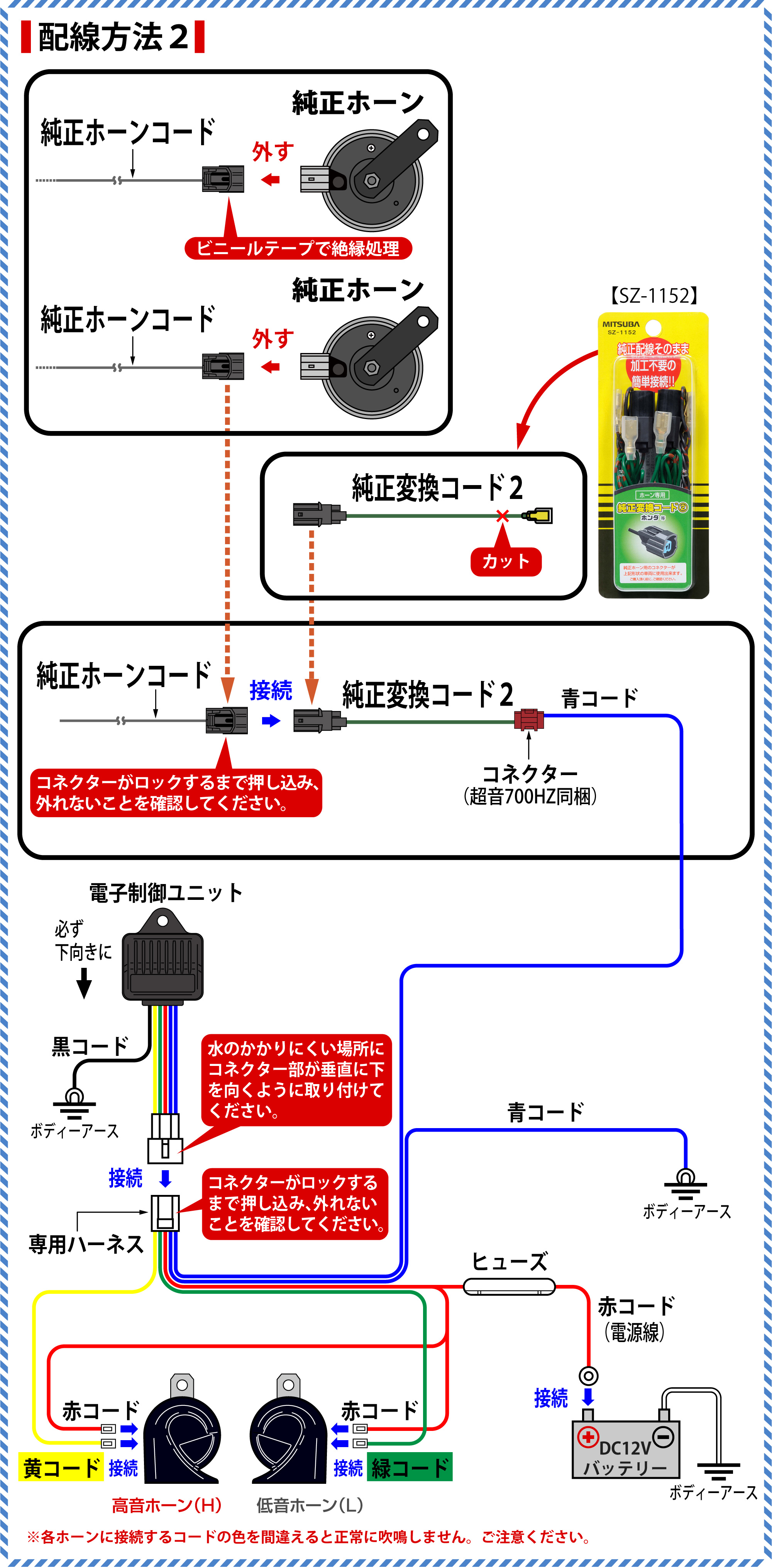 ※配線接続後は、ホーンボタンを押しホーンが正常に吹鳴するか確認してください。