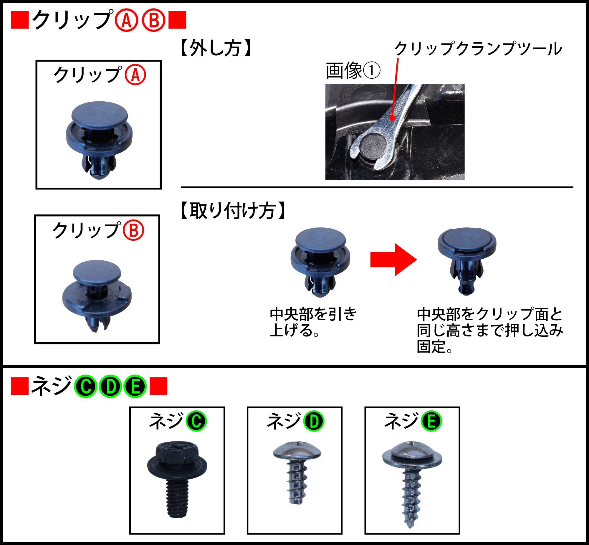 2.事前準備、クリップ、フック、ネジの形状とクリップ、フックの外し方・取り付け方