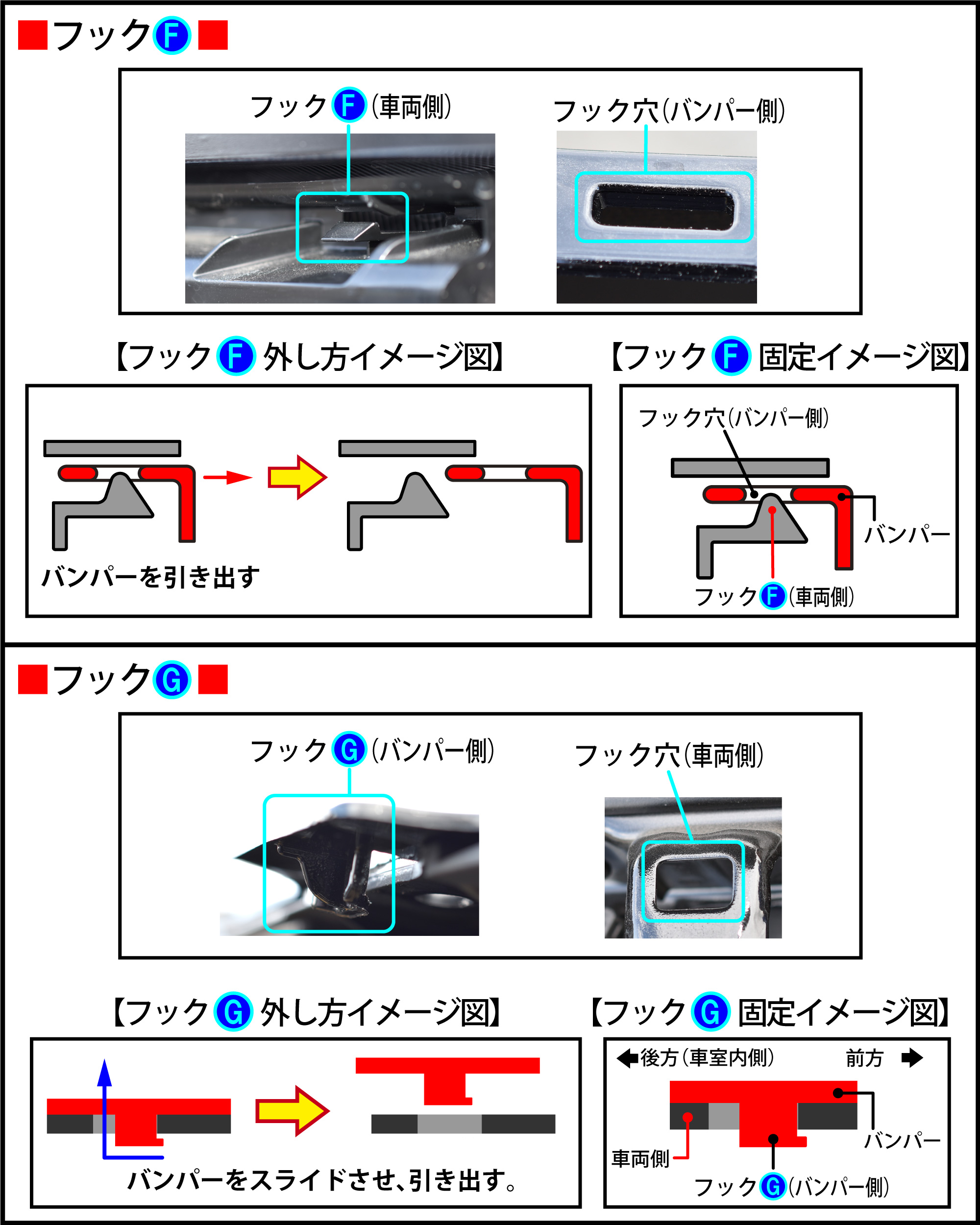 『フックF外し方イメージ図』のようにバンパーを引き出します。