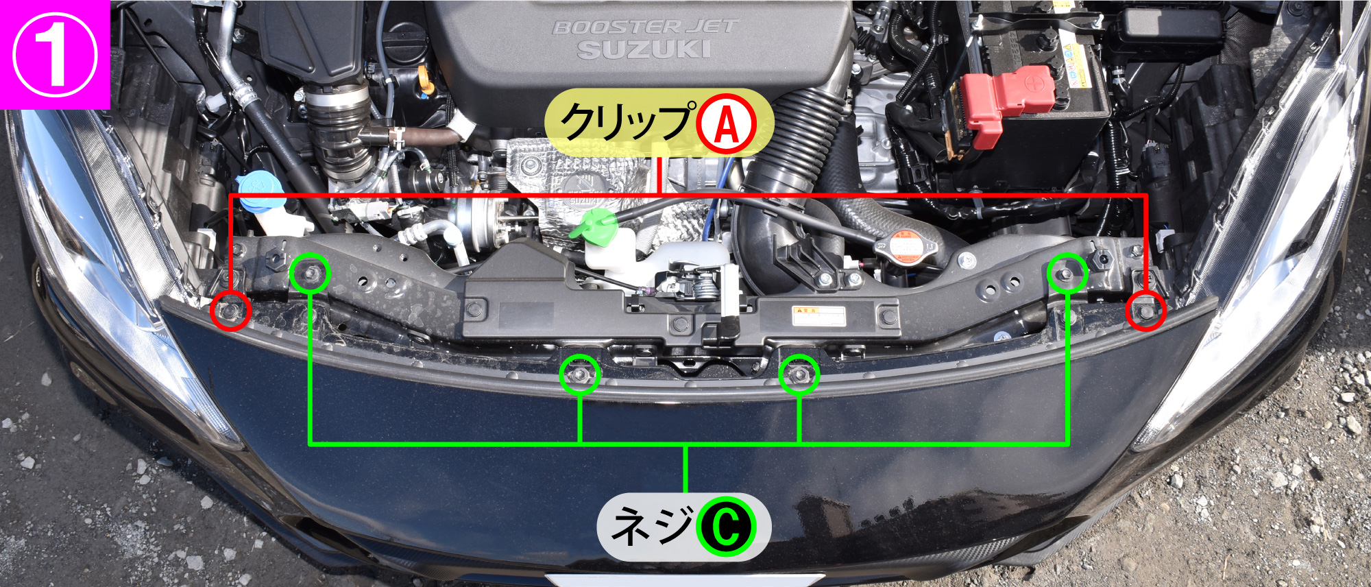 - ボンネットを開け、クリップA(2箇所)とネジC(4箇所)を外します。