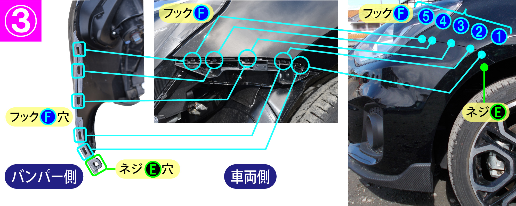 - タイヤハウス内のネジE(左右各1箇所)とバンパー両端部のフックF(左右各5箇所)を①~⑤の順番で外します。