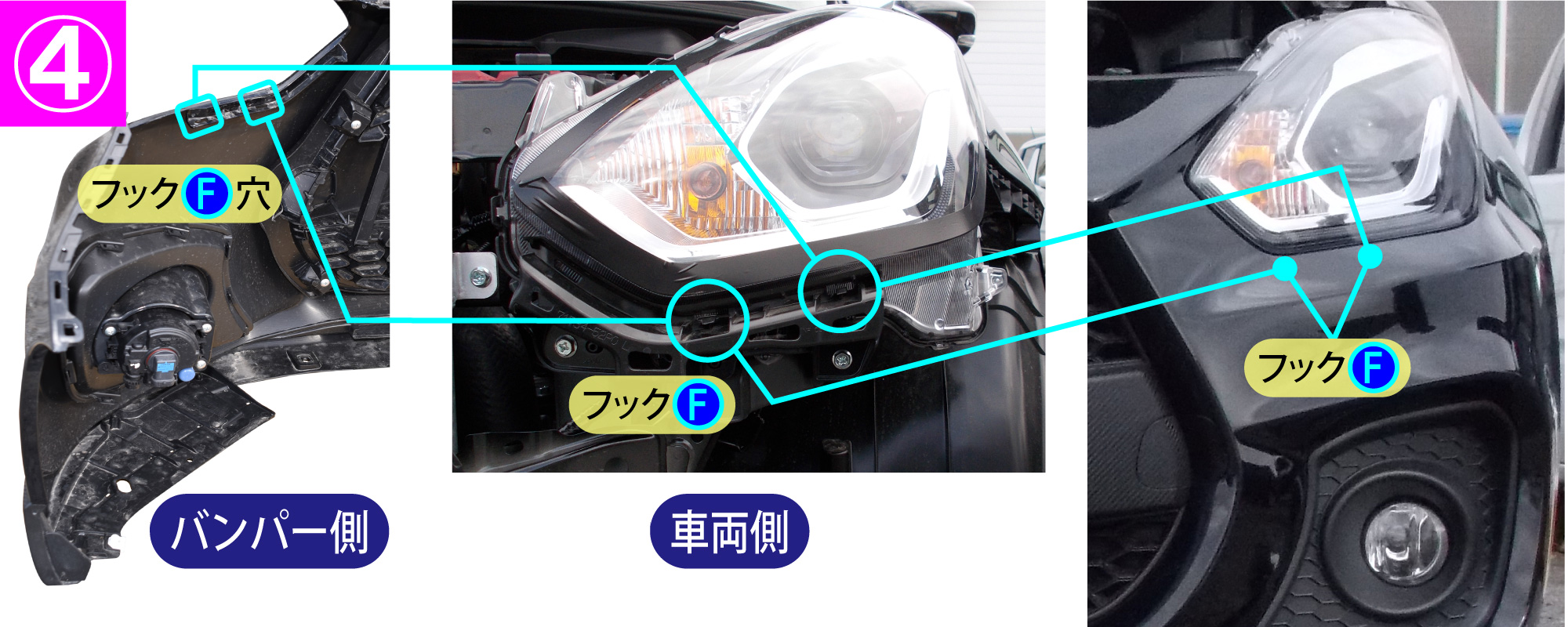 - ヘッドライト下のフックF(左右各2箇所)を外します。
