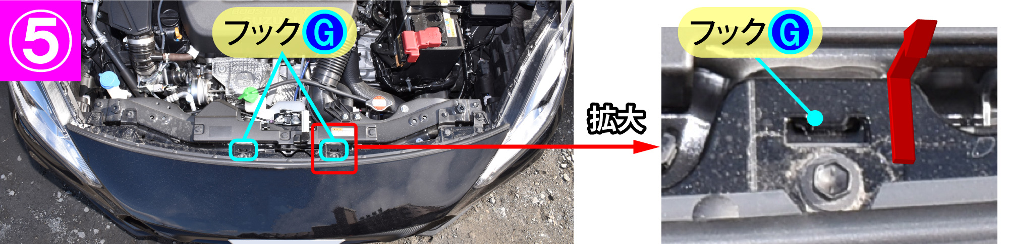 - バンパーの上面からフックG(2箇所)を外すとバンパーが外れます。