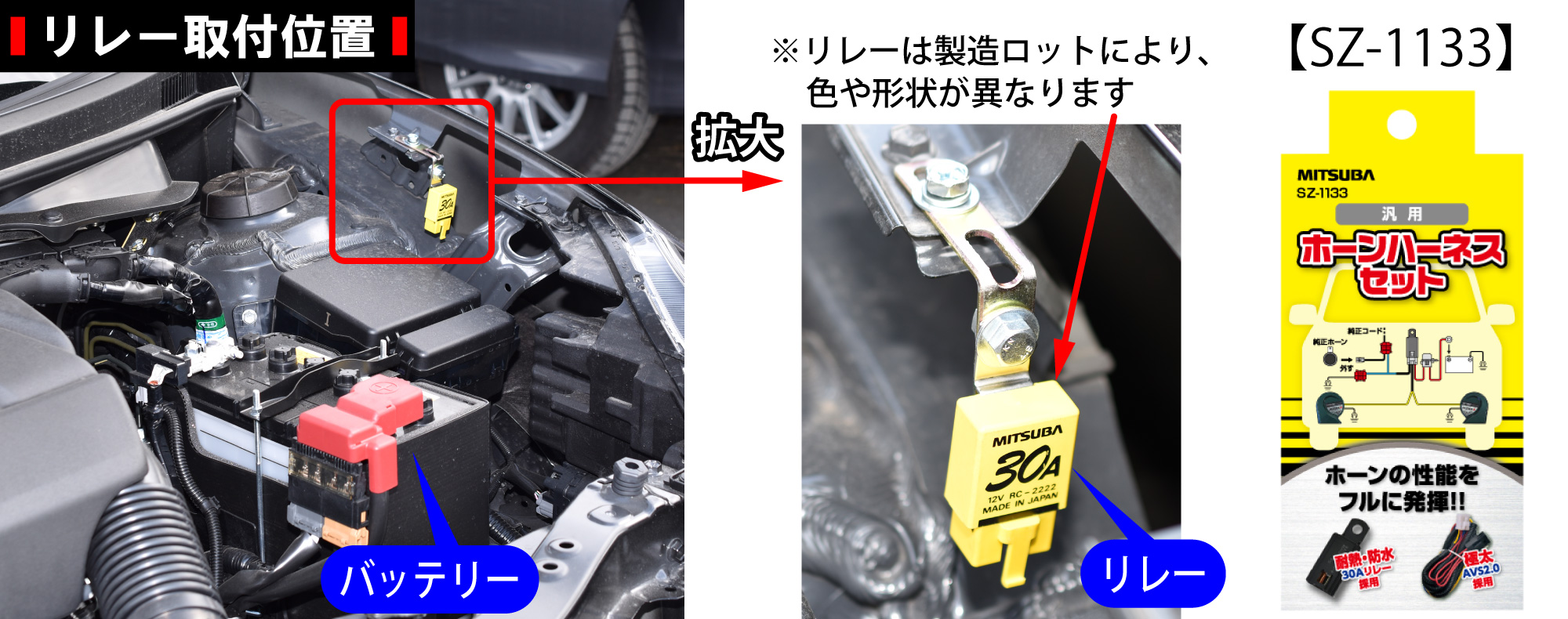 ※ホーンハーネスセット(SZ-1133)とは、ホーン接続用にリレー回路が組まれた配線キットです。ミツバ製ホーンはもちろん、各メーカーのホーンも簡単・確実・短時間で配線出来ます。