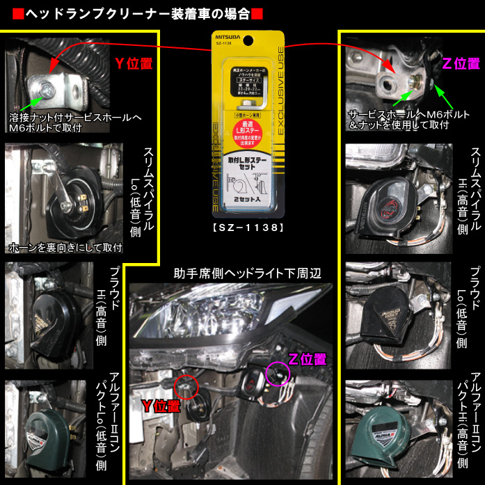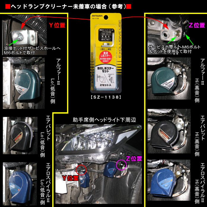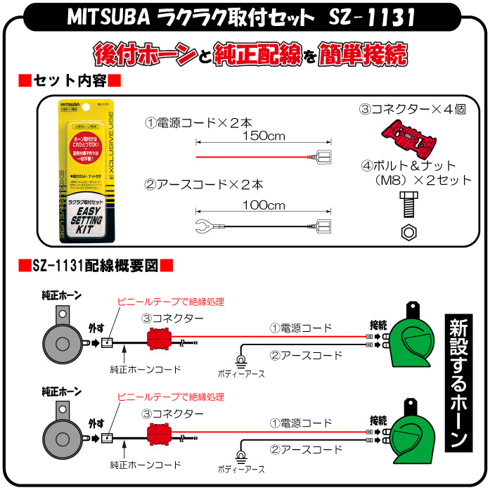 ※当社製のSZ-1131(ラクラク取付セット)を使用すれば、後付けホーンと純正配線を簡単に接続することが出来ます。