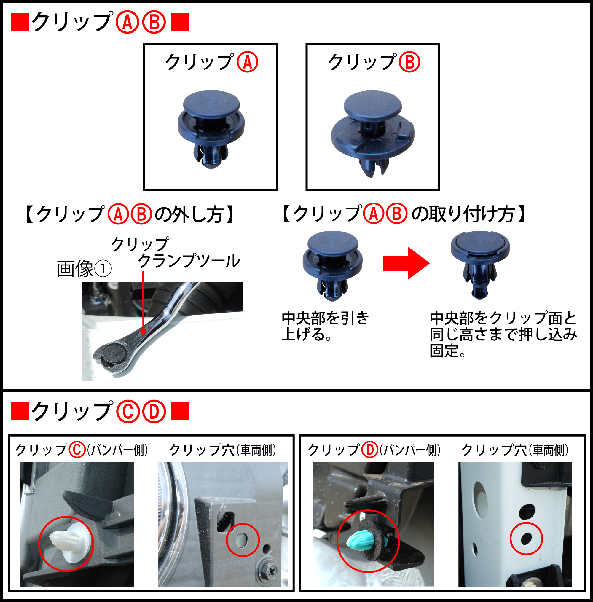クリップクランプツール等で画像①のように中央部を少し引き上げ、クリップ全体を手で引き抜きます。