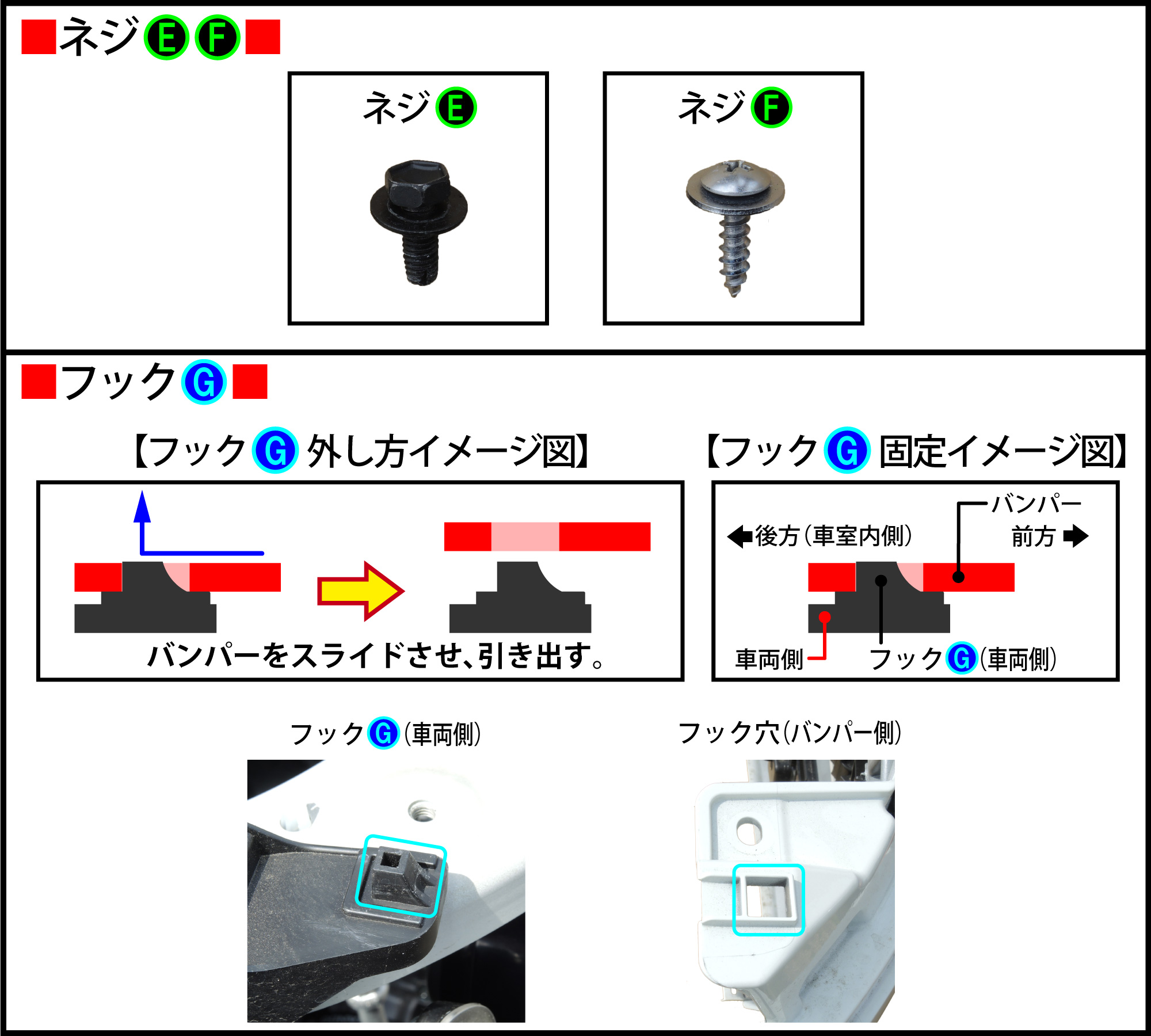 『フックG外し方イメージ図』のようにバンパーを引き出します。