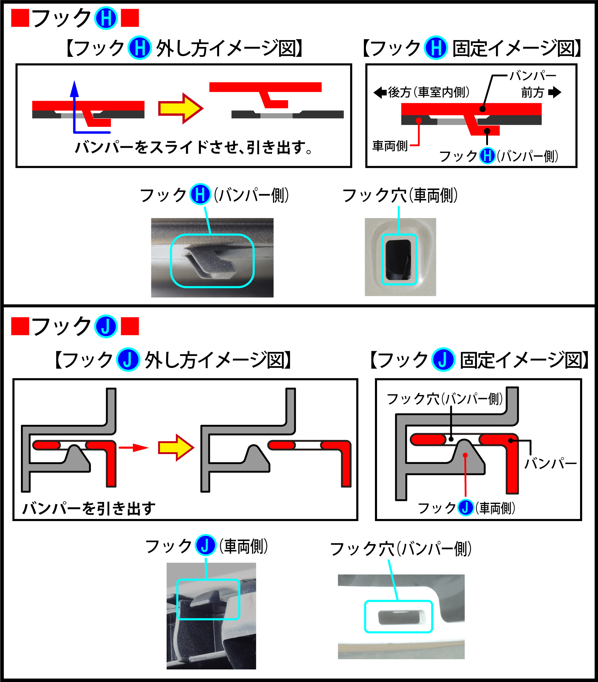 『フックH外し方イメージ図』のようにバンパーを引き出します。
