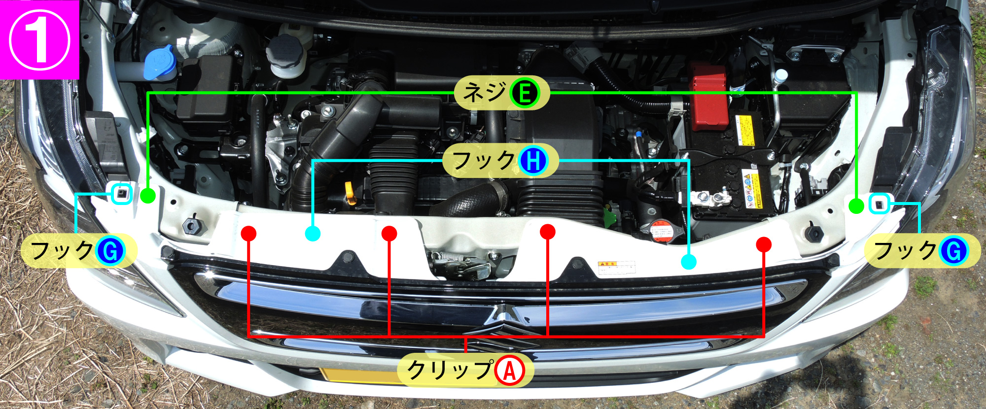 - ボンネットを開け、バンパー上面のネジE(2箇所)とクリップA(4箇所)を外し、フックG(2箇所)とバンパーの裏側にあるフックH(2箇所)を同時に外します。