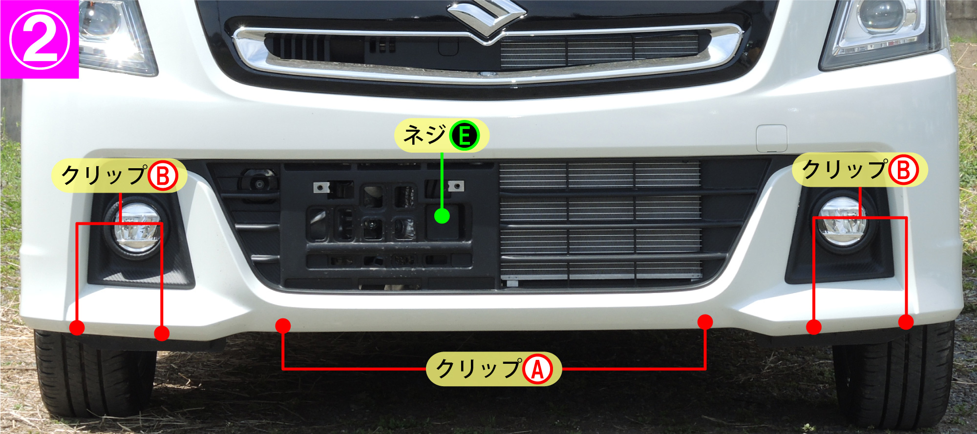 - ナンバープレートを外し、ナンバープレート裏にあるネジE(1箇所)とバンパー下面にあるクリップA(2箇所)とクリップB(4箇所)を外します。