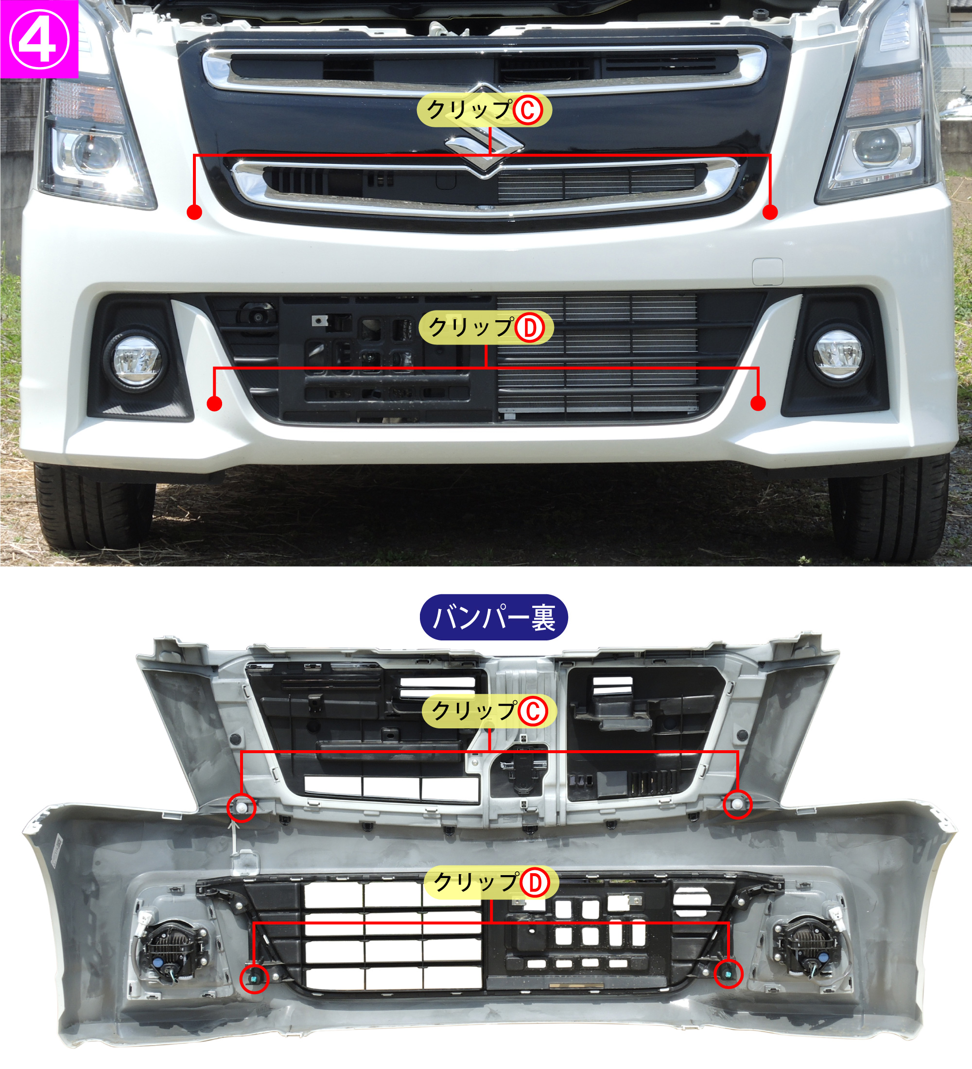 - バンパー裏にあるクリップC(2箇所)とクリップD(2箇所)を外すとバンパーが外れます。このとき、バンパー裏にフォグランプ等の部品が固定されていますので、配線などを損傷させないよう注意してください。