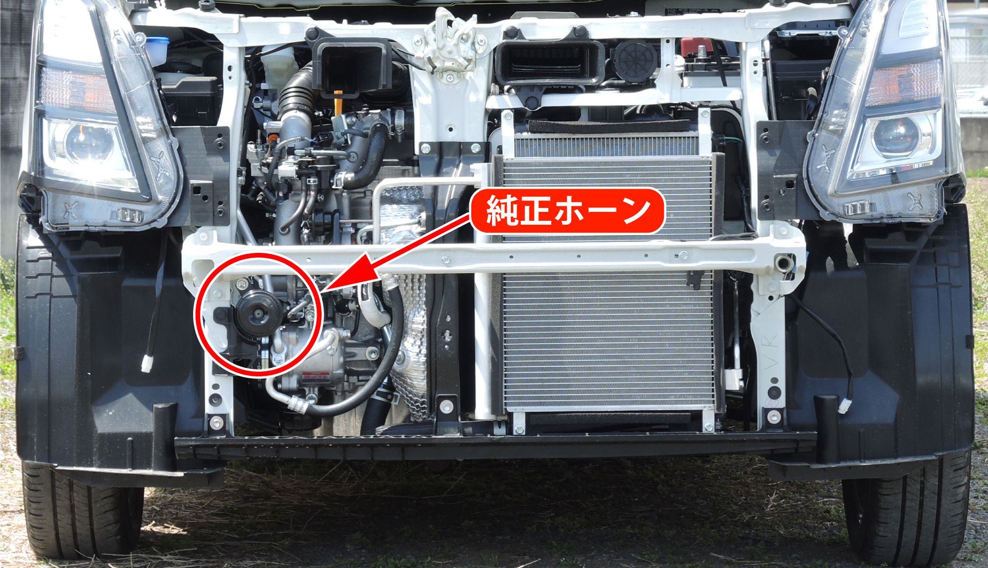 新設ホーンは、運転席側ヘッドライト脇の位置と助手席側ヘッドライト脇の位置へ取り付けます。