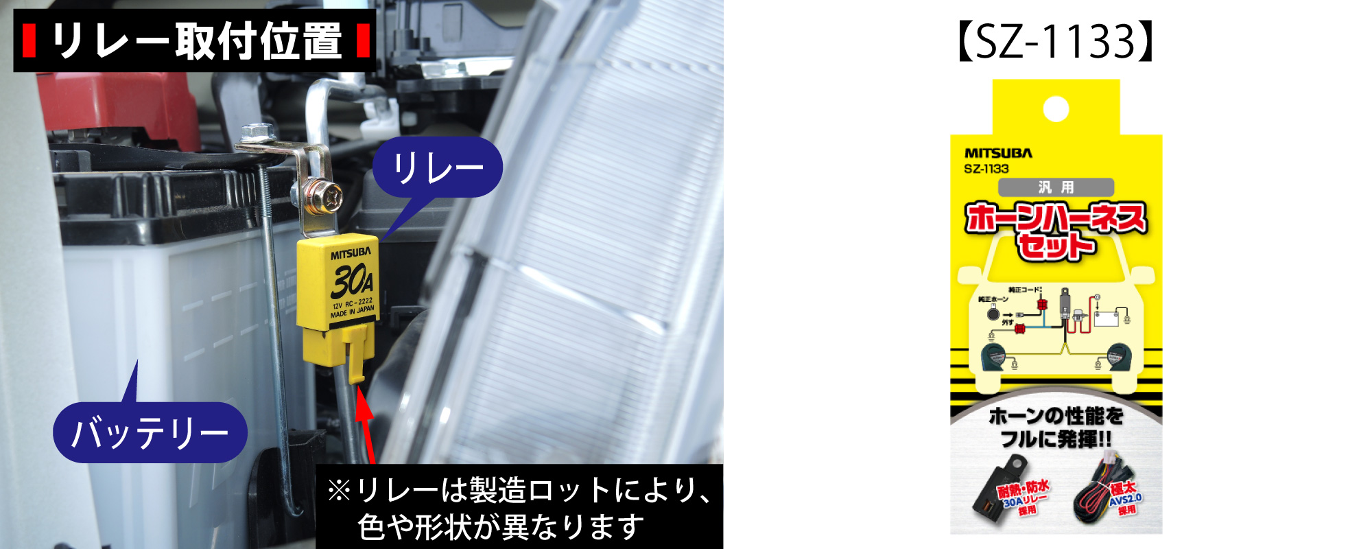 ※ホーンハーネスセット(SZ-1133)とは、ホーン接続用にリレー回路が組まれた配線キットです。ミツバ製ホーンはもちろん、各メーカーのホーンも簡単・確実・短時間で配線出来ます。