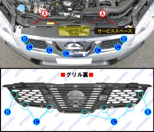 次にグリル上面のサービススペースから手を入れ、グリル裏側のフック B(2箇所)、フックC(5箇所)を外しておいてから、グリルを車両前方に引き出すようして取り外します。