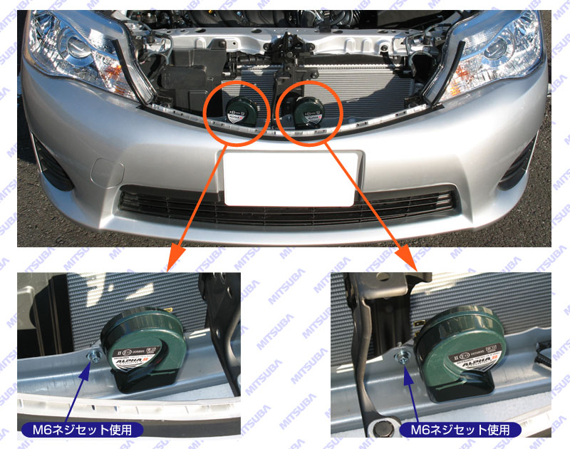 新設ホーンは画像の位置へM6ネジセットを別途用意してバンパーフレームの穴へ取り付けました。