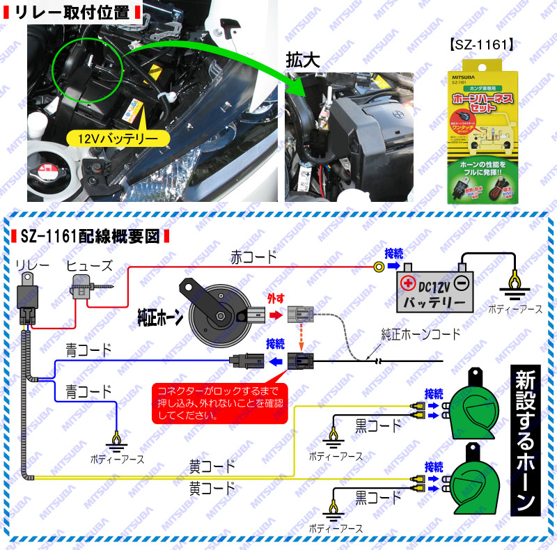 ※SZ-1152(純正変換コード2)を使用すれば、純正ホーンコネクターとの接続がワンタッチで出来るため、純正コードを傷めることがありません。参考までに、この車両に配線した配線概要図を掲載しておきます。