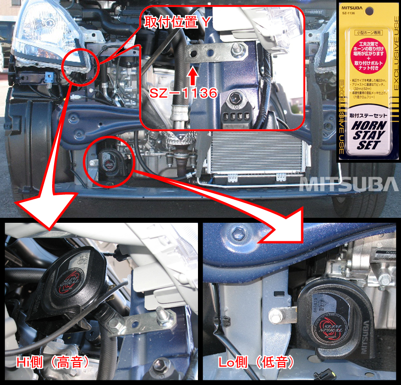 取付位置Y(運転席ヘッドライト脇のフレーム)に当社製のSZ-1136(取付ステーセット)を使用してにLo側(低音)を取り付けます。Hi側(高音)は、純正ホーンの位置へ裏側からワッシャーをはさんで取り付けます。