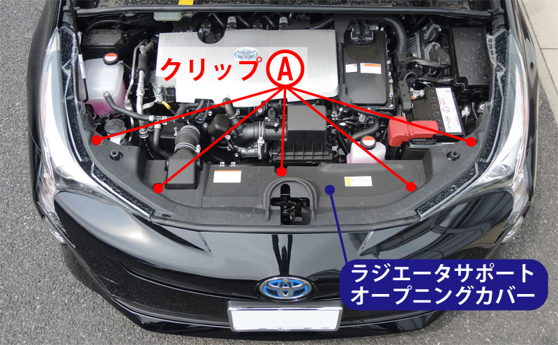 ボンネットを開けてクリップA(5箇所)を外し、ラジエータサポートオープニングカバーを外します。