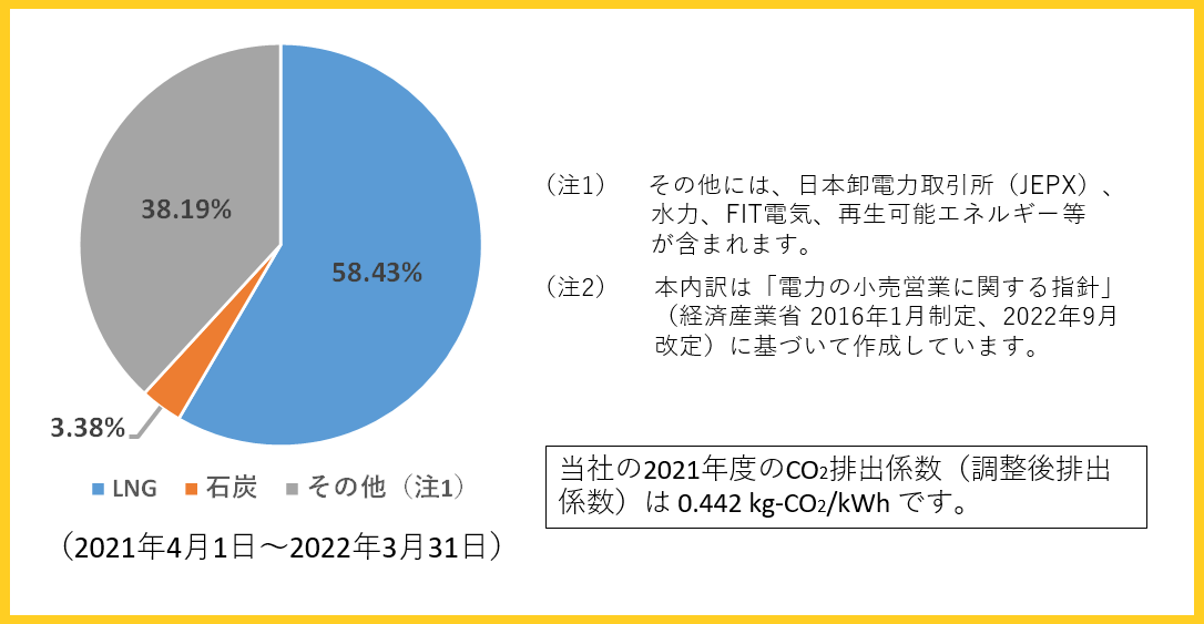 当社は主に天然ガス(LNG)による火力発電からの電気を利用しておりますが、お客さま数の増加に伴い、外部からの電源調達も加えお客さまに電気を供給しています。 これらを含めた2021年度の電源構成の実績値は、下記のようになりました。
