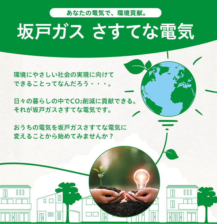 坂戸ガスでは、「坂戸ガスさすてな電気」の収益金の中より、地域貢献のために、10契約ごとに1契約につき1,100円を坂戸市に寄付させていただきます。寄付の時期につきましては、弊社HPにてご周知致します。