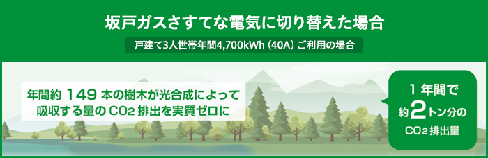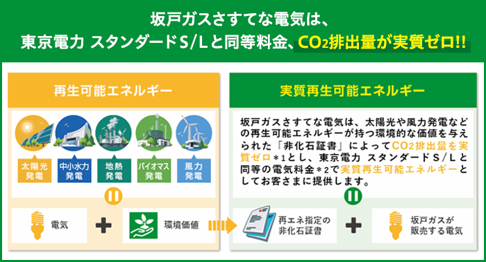 *1 坂戸ガスの電力取り次ぎ元である東京ガスが再エネ指定の非化石証書を購入することによりCO2排出量が実質ゼロになることを意味します。